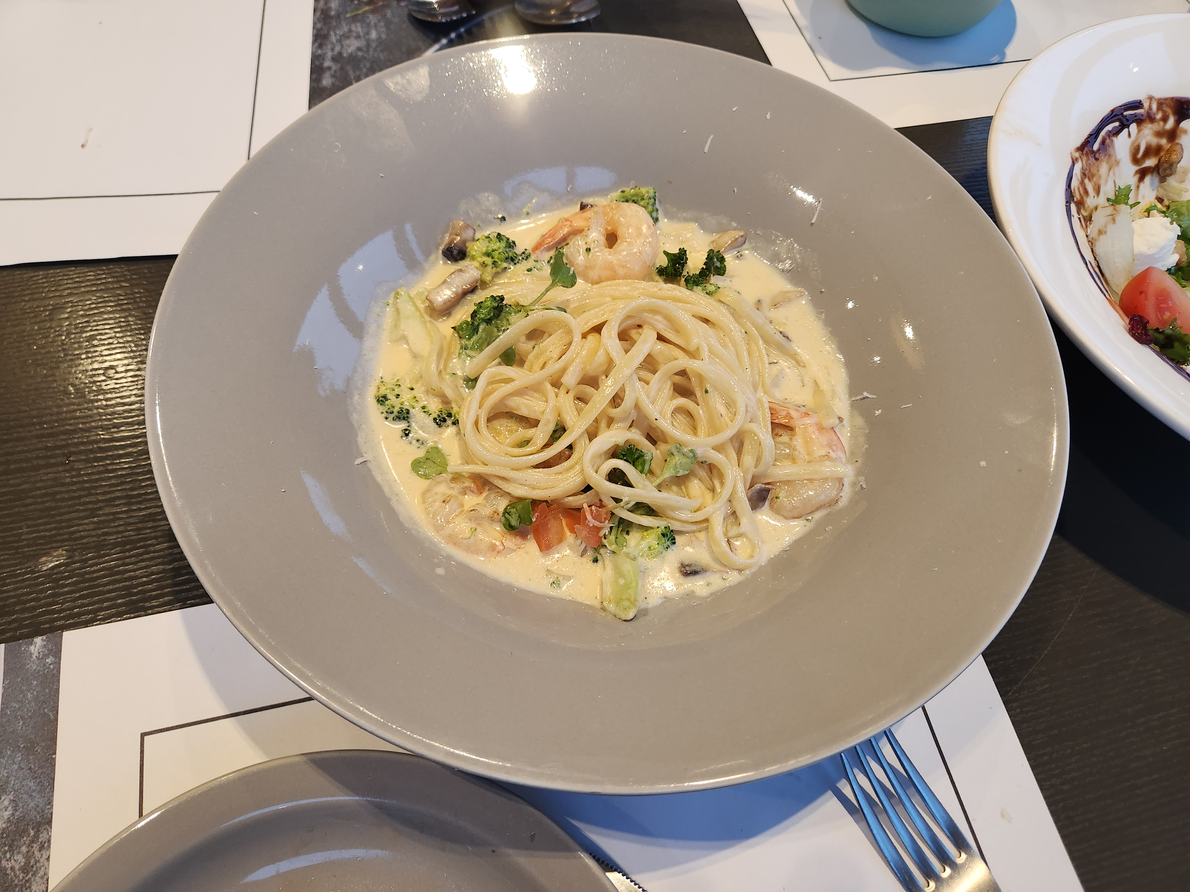 저희는 안심스테이크와 쉬림프가 들어간 크림 파스타를 시켰어요.