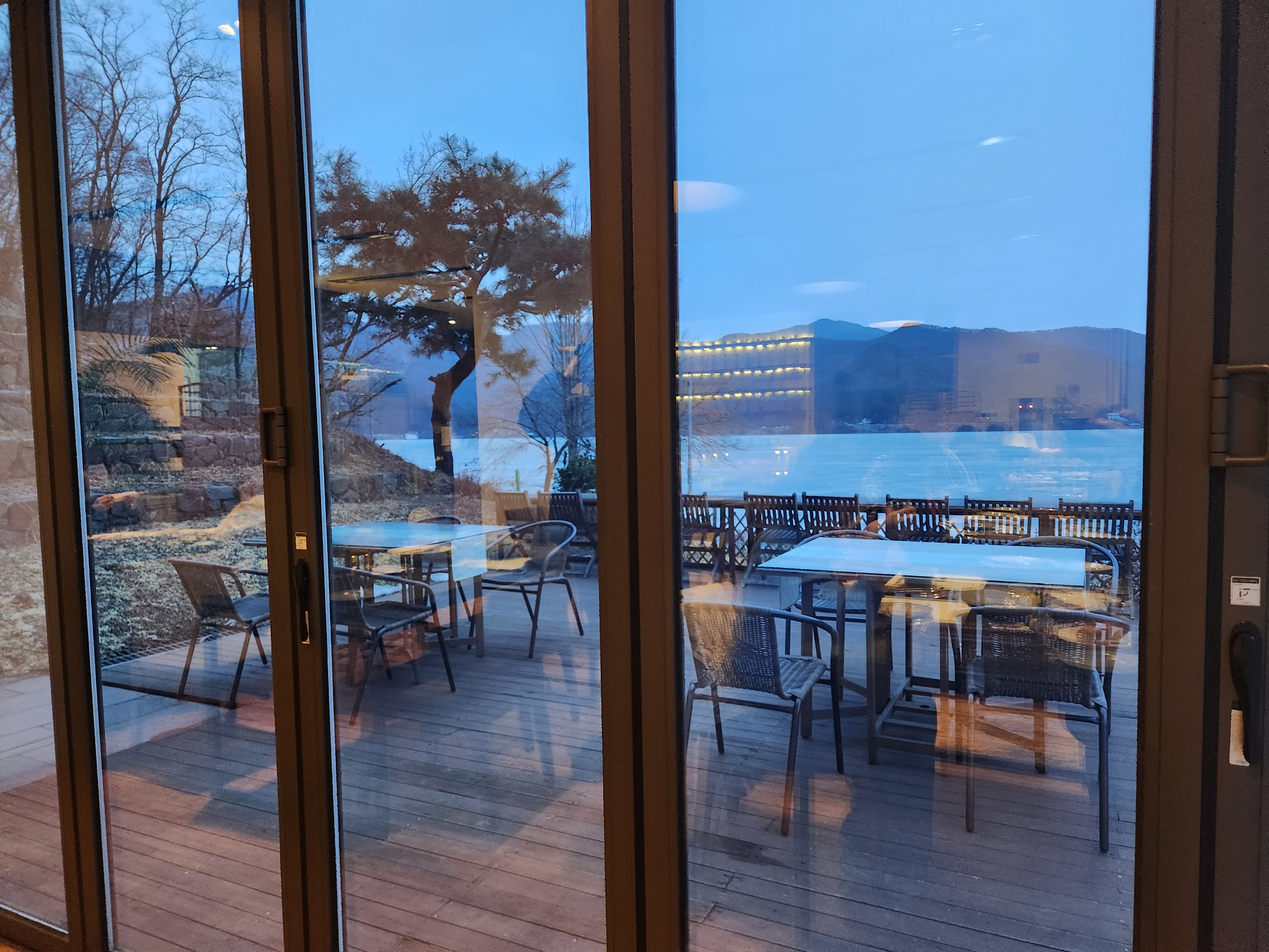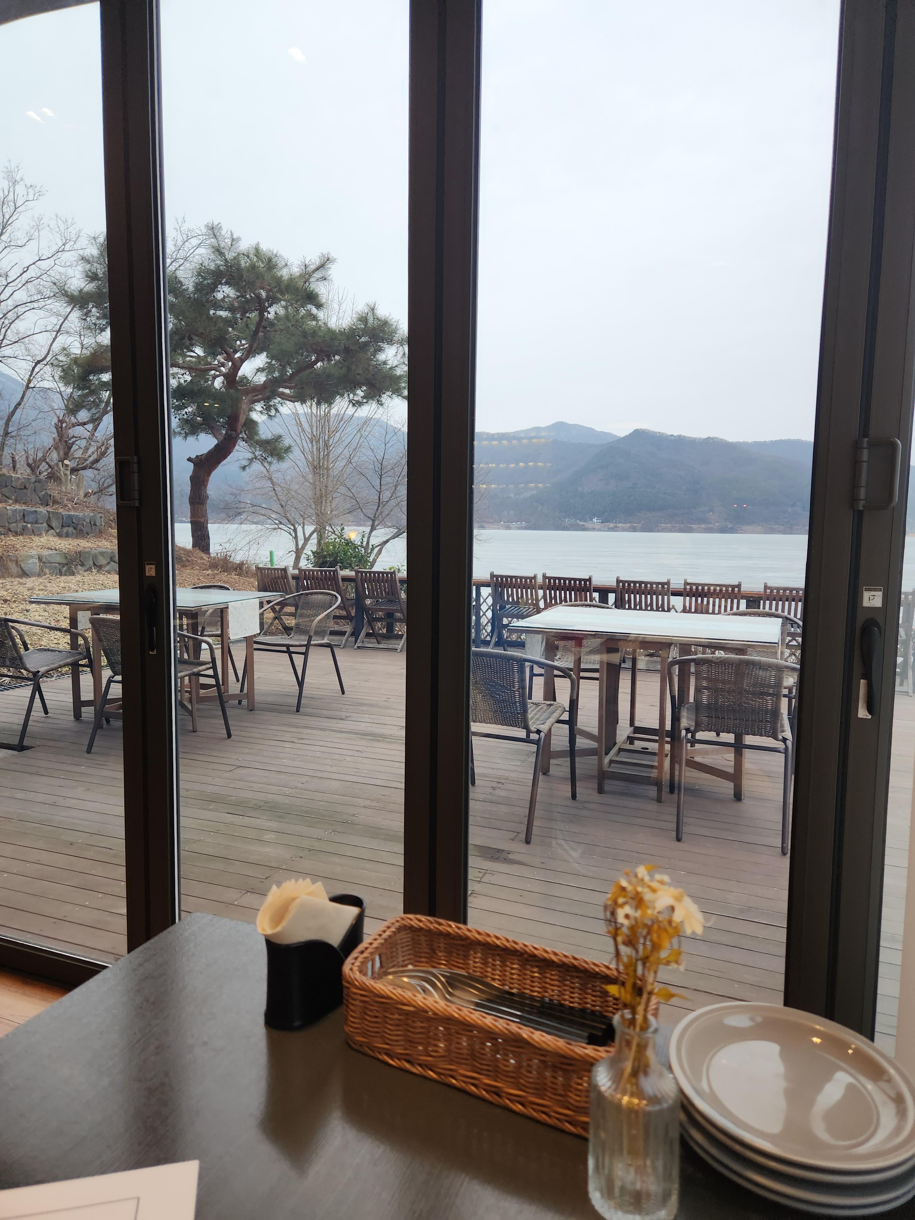 그리고 식당이 보여요. 깔끔해요. 저 멀리 팔당호가 보여요.
