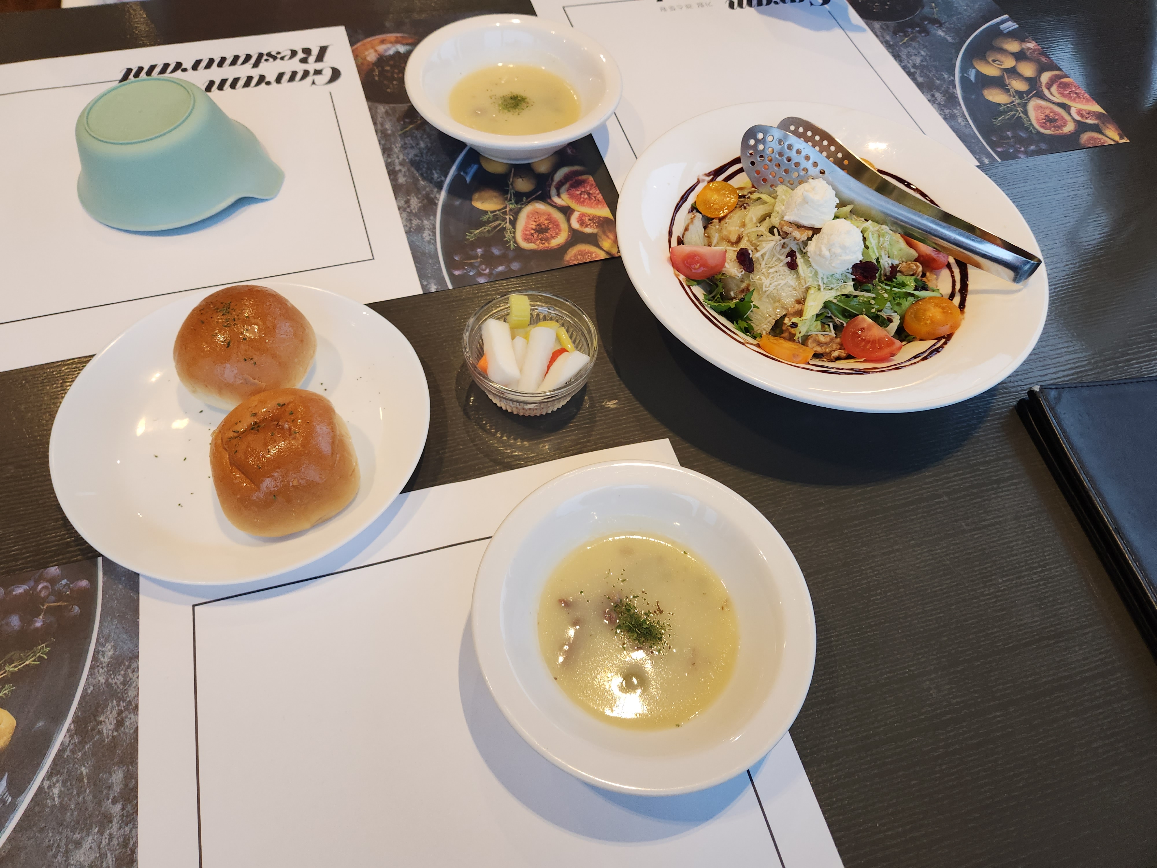 1인 3000원을 추가하면 샐러드 식전빵 스프도 먹을 수 있더라구요. 당연히 주문해보았죠.