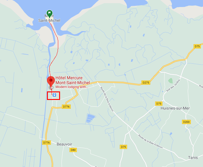 차에 네비 찍고 달리다보니 저 멀리 몽쉥미셸이 보이더라구요. 하지만 여기서 1시간은 해맨것 같아요. 저희는 아래 그림의 Hotel Mercure를 예약했어요. 그런데 호텔에 들어가는 입구쪽이 차단되어 있었습니다..아래 빨간 네모로 표시해놓은 위치쯤 되는데 차단되어 있는 곳엔 사람도 없고 무슨 비밀번호 같은걸 누르면 열리게 되어 있는 구조입니다. 뒤에서 차는 한 두대씩 오고 들어가는 방법은 모르겠고 어쩔수 없어 바로 옆에 보이는 유료주차장에 잠시 주차를 시켜놓고 걸어서 호텔로 들어갔어요. 그랬더니 호텔에서 무슨 코드? 번호 같은걸 주더라구요. 그 코드 받고 다시 20분 정도 걸어 유료주차장에서 차를 가지고 호텔로 들어왔습니다. 차단기에 번호 누르니까 차단문이 열리더라구요. 렌트카 가지고 몽생미셸 앞 호텔 들어가시는 분들은 꼭 사전에 호텔에 연락해서 어떻게 들어가야 하는지 확인 하시기 바랍니다. 그리고 호텔직원이 분명히 저한테 호텔에 묵으시는 분들은 주차 공짜라 그랬는데 차 가지고 나갈때 문제의 차단기는 돈 내야만 열리니 참고하시기 바랍니다. 나가면서 호텔직원한테 속았구나 하면서 탄식했어요. 대략 2년 전이니 지금은 또 어떻게 바뀌었을진 모르겠네요.
