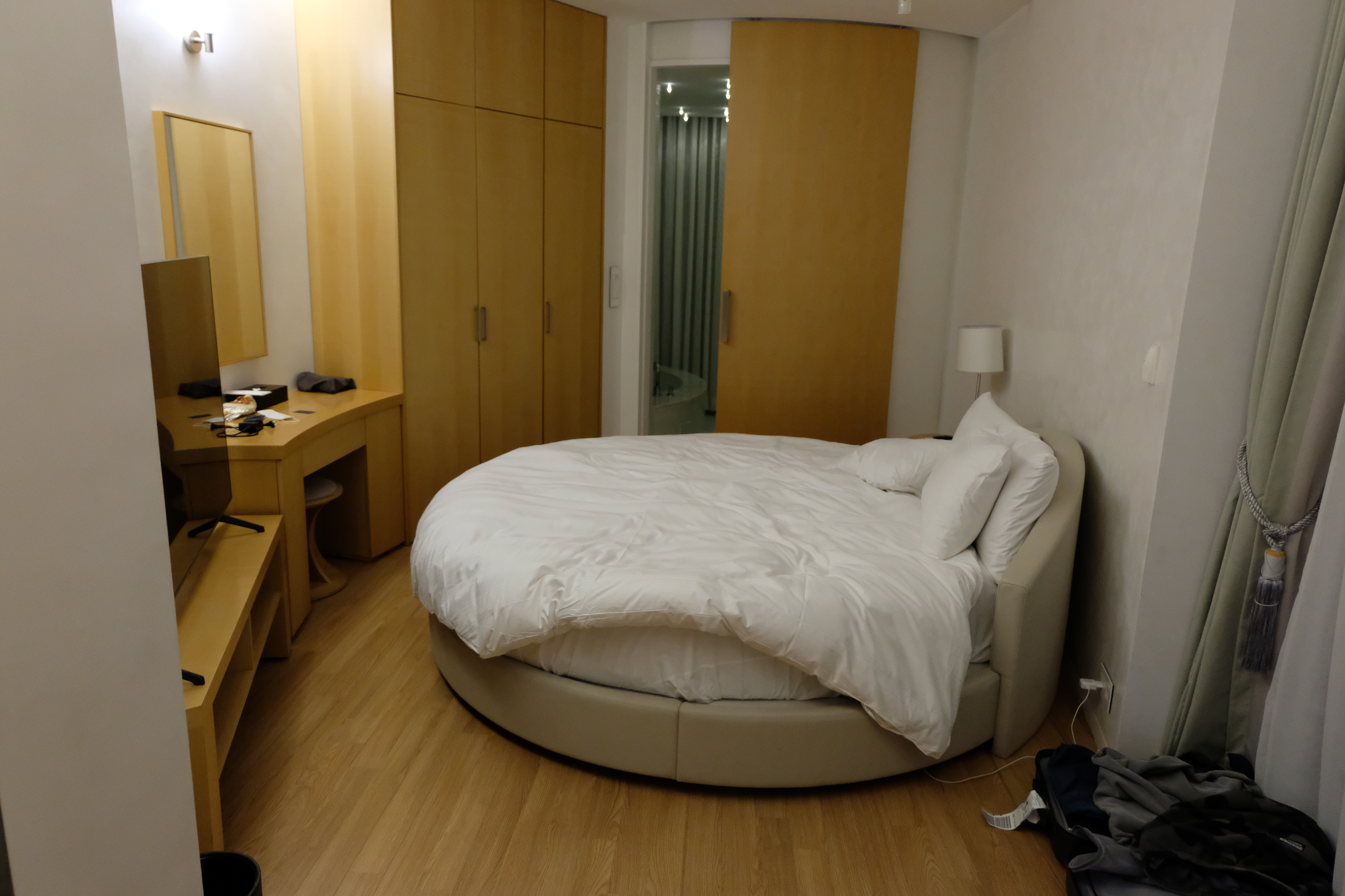 그리고 여행에서 정말 중요한 침실입니다. 침실은 총 세 곳이 있었고, 두 곳은 침실 옆에 바로 화장실이 하나씩 있는 구조였으나, 침실 하나는 화장실이 별도로 안 붙어 있었어요. 대신 1층 2층 각각 공용 화장실이 하나씩 있습니다. 사진 보시면 침대가 동그라미여서 약간 적응이 안될까 걱정했으나, 생각보다 편하더라구요 ㅎㅎ 티비 같은건 시간이 아까워서 틀어보지도 않았고 에어컨은 이 곳 저곳 벽에 컨트롤하는게 붙어 있어서 그걸로 틀고 끄고 했었어요. 그리고 방에 붙어 있는 욕실이 저는 너무 마음에 들었었어요.