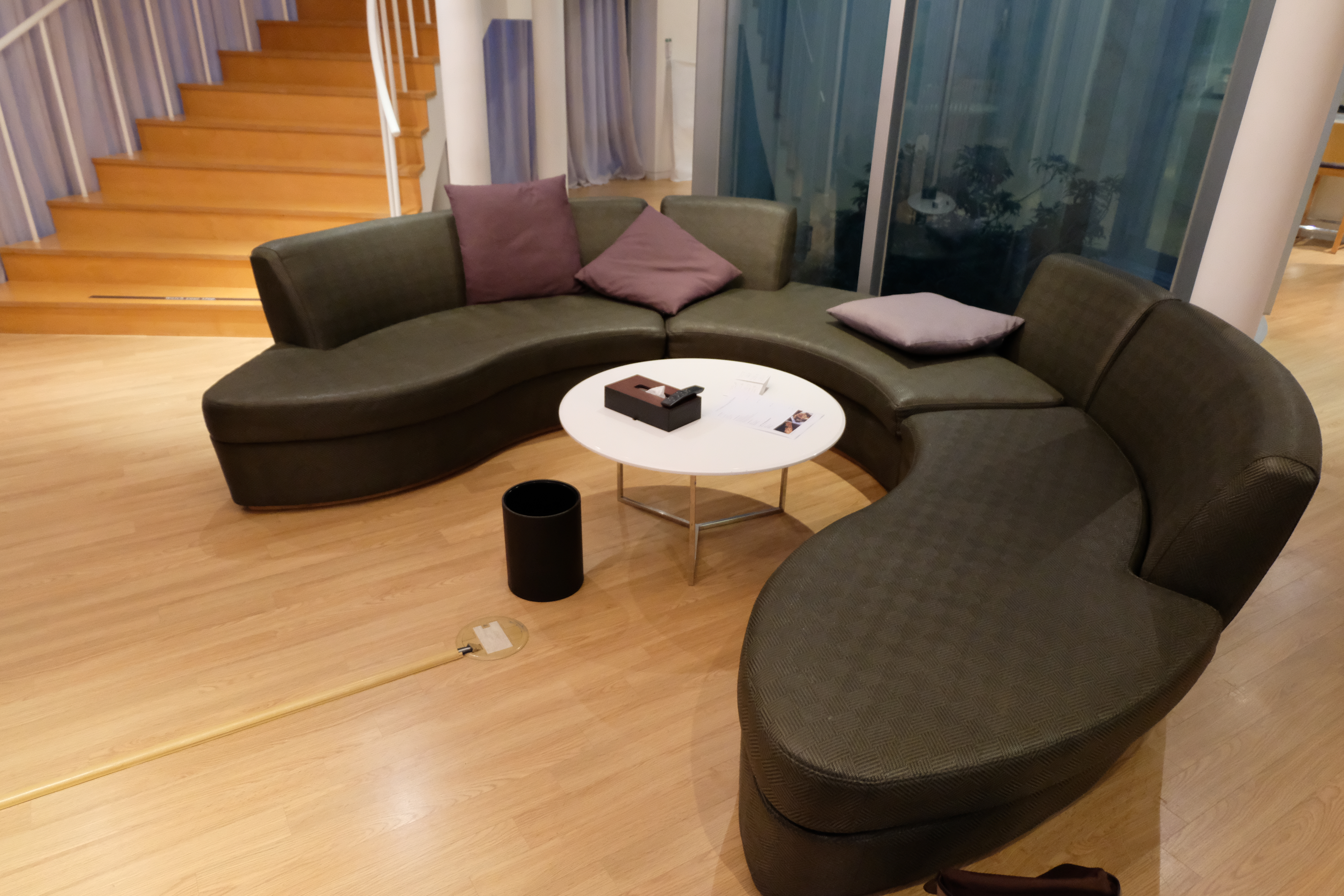 리조트는 2층으로 이루어져 있고 처음에 들어가는 입구는 2층이에요. 2층에는 침실 두 곳이 있었고 공용 화장실 하나가 있구요. 옥상으로 올라갈 수 있는 야외로 이어지는 문이 있어요. 저희는 잠시 옥상가서 하늘보고 누워있다가 오기도 했습니다. 겨울 바람이 시원하고 좋더라구요. 그리고 2층 입구 바로 옆 계단을 내려가면 1층 거실과 부엌이 나와요! 거실과 부엌 사이에 건물 중앙을 위로 뚫고가는 동그라미 모양의 작은 화단이 있고, 거실 바로 옆에는 방이 하나 더 있습니다. 그리고 거실에서 자쿠지 방향을 볼 수 있는 통 유리창이 있어요. 수동커튼이 좀 거슬리긴 하는데 매우 쾌적합니다.