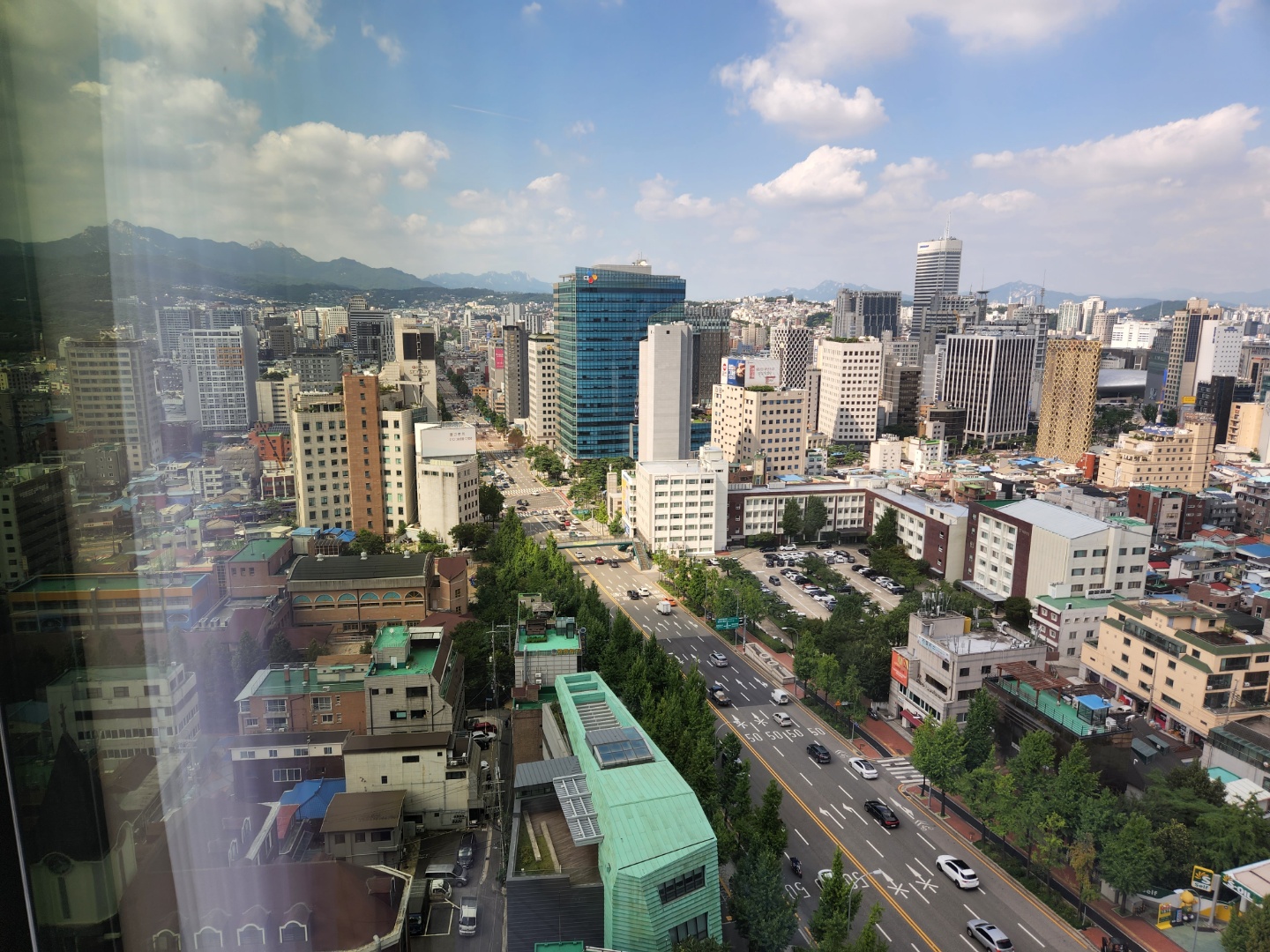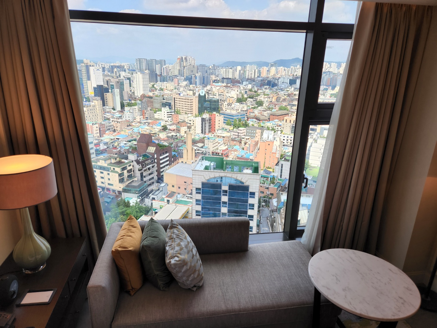 저희는 17층 도시뷰가 보이는 디럭스 킹 룸에서 숙박을 했어요. 객실은 깨끗했고 뷰가 깔끔하니 좋았어요. 왼쪽 끝에 남산이 있었습니다. 남산뷰에 대한 로망은 없었어요. 대신 객실에서 수영장이 아래로 바로 보여 사람이 얼마나 있는지 바로바로 확인이 가능했어요. 객실은 모두가 아실만한, 둘이서 놀기 딱 적당한 사이즈였어요. 크지도 너무 작지도 않고 화장실은 욕조가 있고 넓어서 좋았어요! 창가에 있는 소파도 편했고, 도자기로 디자인된 스탠드가 예뻤어요. 호텔 중간중간이 도자기로 장식되어 있었는데 매력있더라구요. 도자기 곡선이 아름답다는 생각은 처음해본것 같아요. 마음이 편안해요.