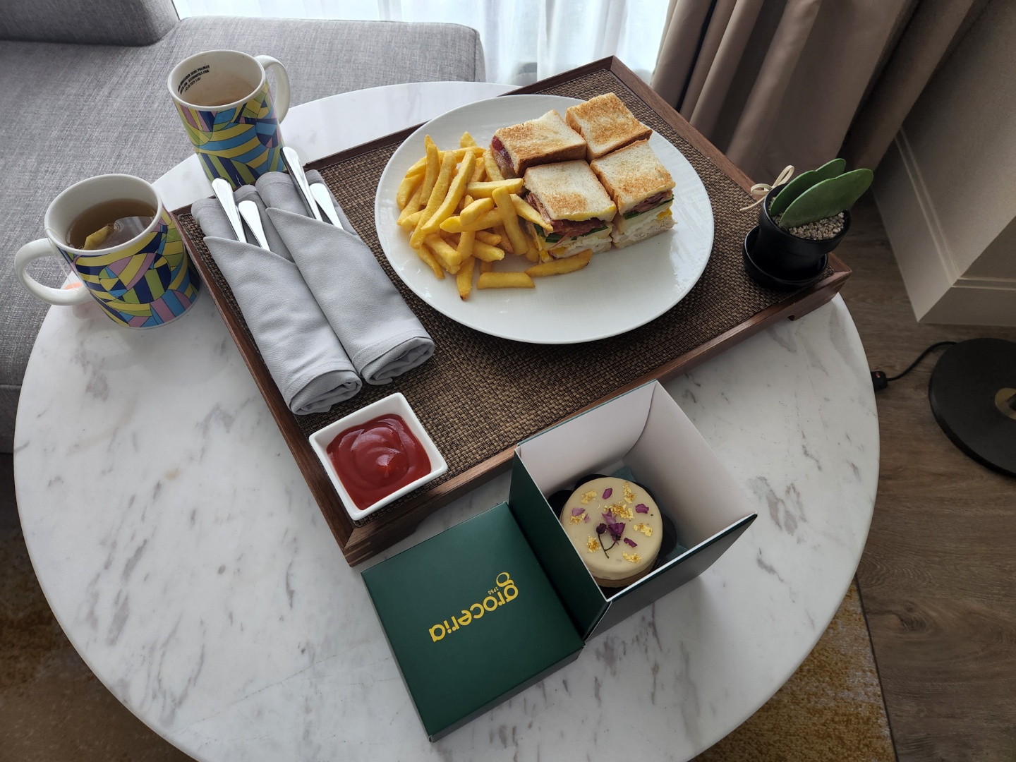 일단 저희는 이번에 조식을 결제 안 했지만, 대신 룸서비스 조식을 먹을 예정이었는데요. 10:30 조식 룸서비스 마감 기준으로 30분 더 자버려서 먹고싶었던 조식을 못 시켜 와이프한테 좀 잔소리 듣고. 근데 같이 늦잠 잤어요, 다이닝 룸서비스를 시켰습니다. 다행히 브런치로 이용할만한 클럽샌드위치가 있어서 29,000원인가 주고 시켜먹었어요. 진짜 맛있었어요. 좀 느끼한 부분도 있어서 저는 두조각이 한계였어요.