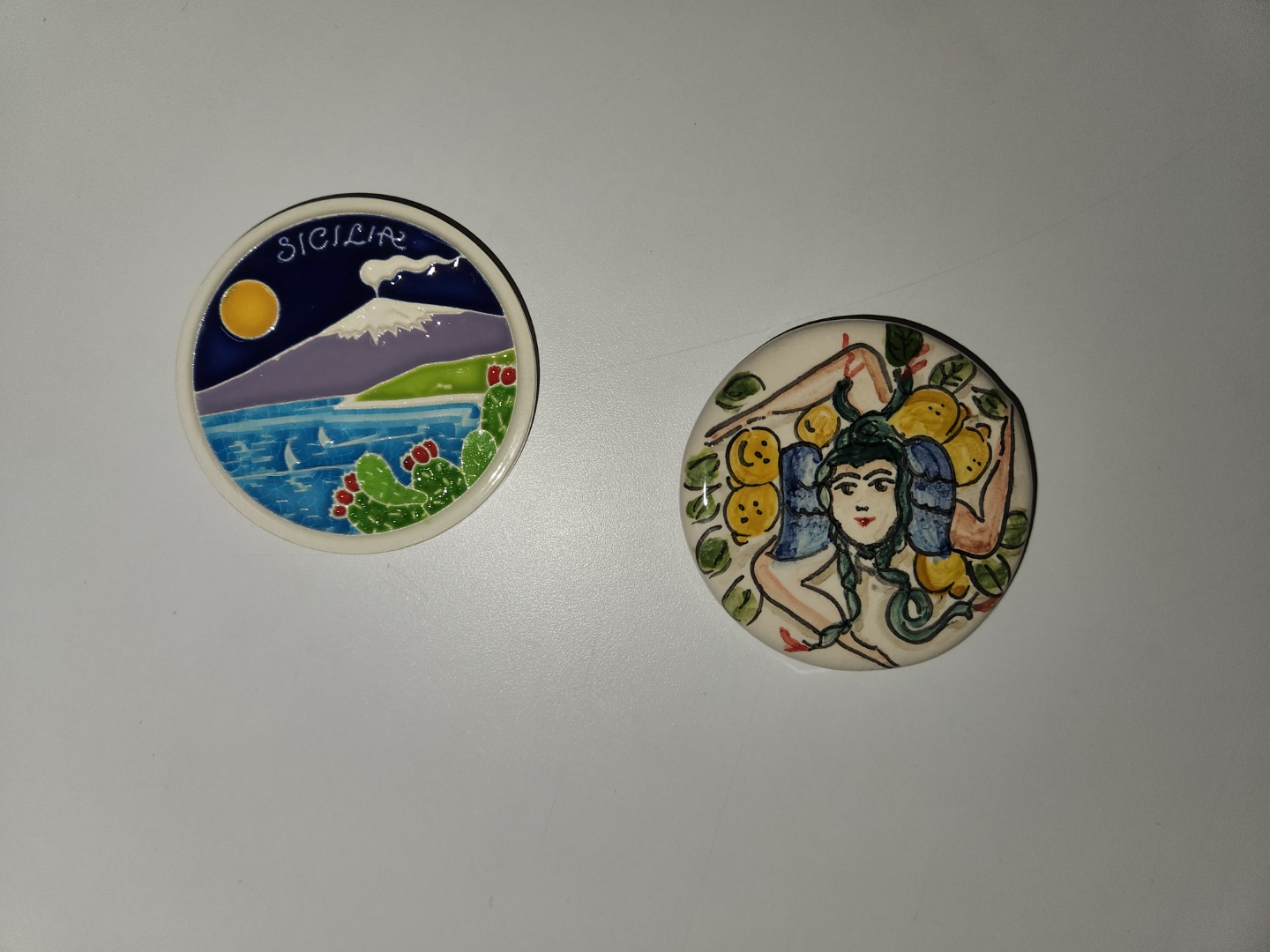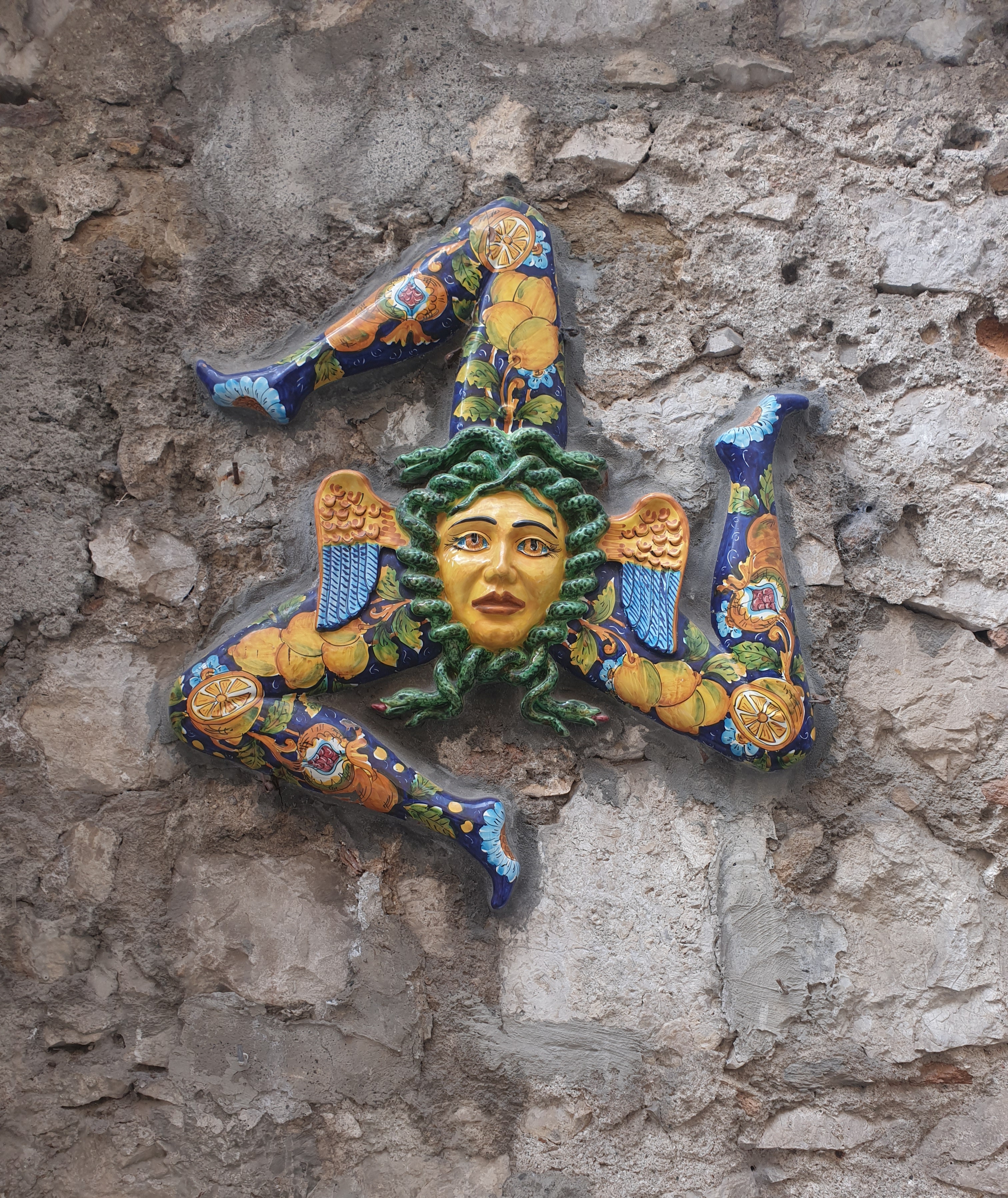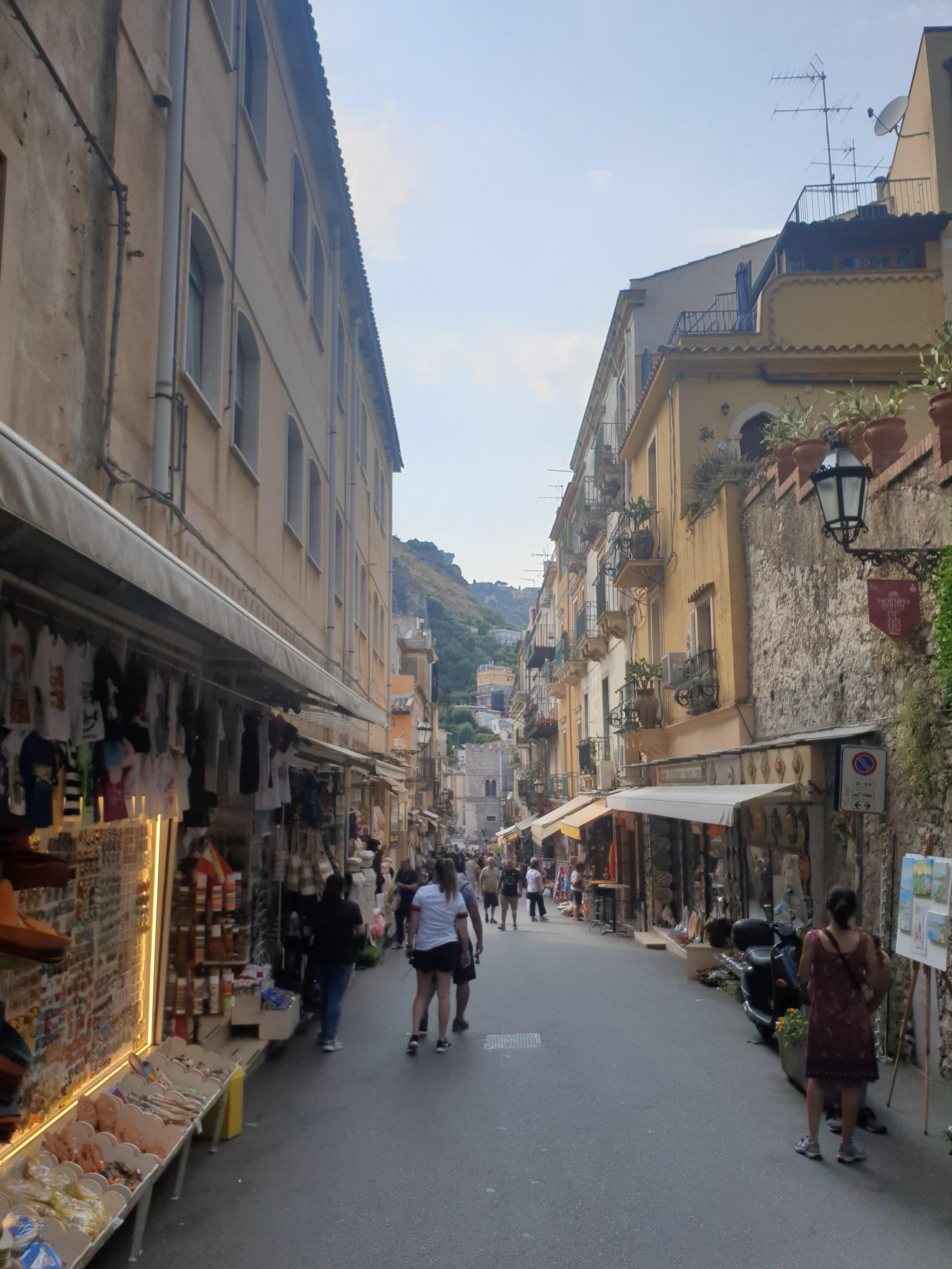 그 후 타오르미나 도시로 향해요. 이탈리안 가이드분께서 타오르미나 도시 투어 시작 지점과 우리가 만날 지점을 알려줍니다. 그럼 주어진 시간 동네에서 신나게 놀면 되어요. 정말 구경할 거리가 많아요. 얼굴에 다리 세 개 달린 수호신도 사진 찍어줍니다. 바로 아래 사진은 타오르미나에서 구매한 최애 여행 기념 자석이에요. 자석 수호신이 저희 집 현관문을 지키고 있어요.