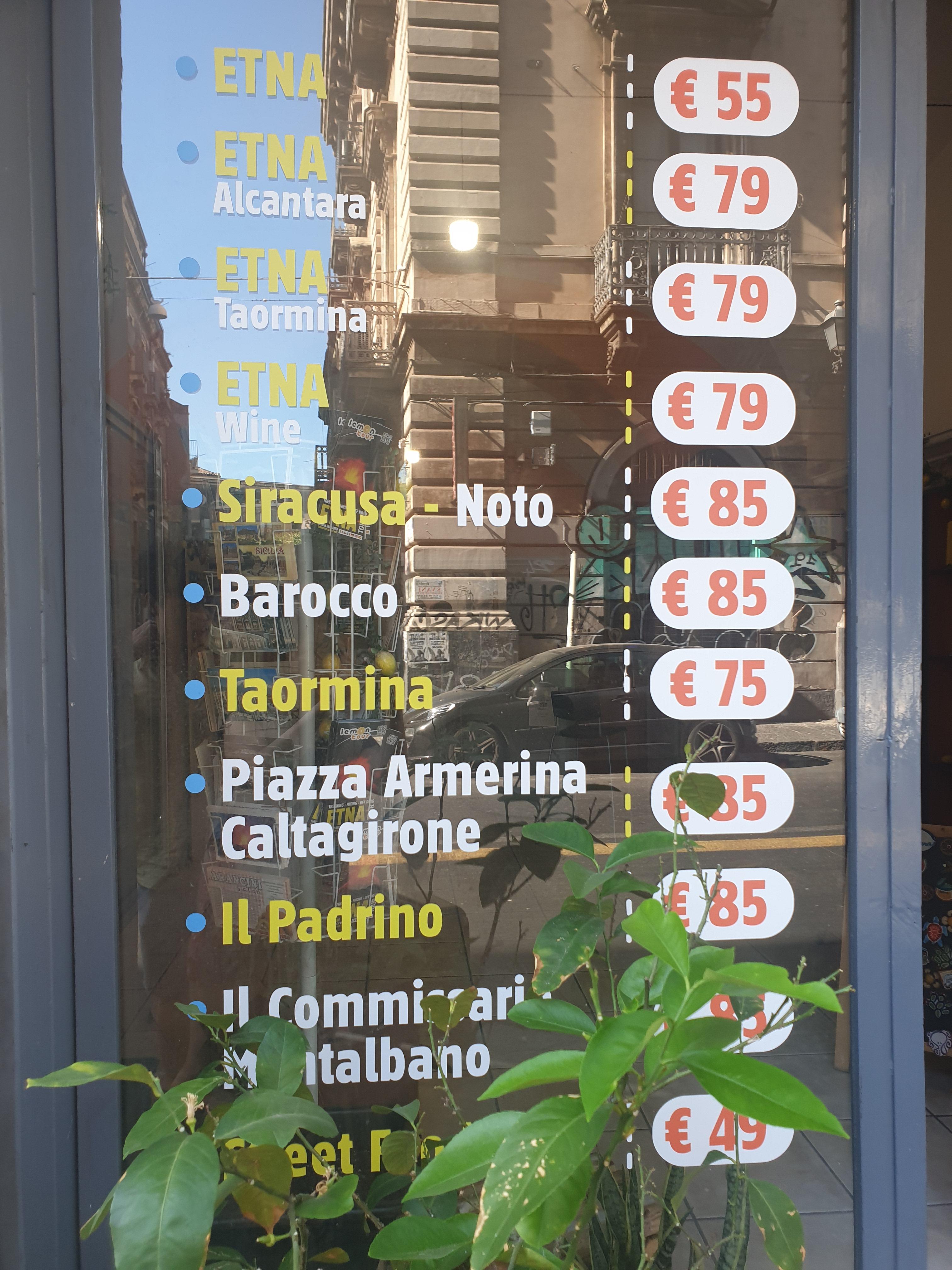 카타니아 주변에 정말 볼 곳이 많지만, 저희 여행의 핵심은 에트나 화산 투어였어요. 투어사 자동차를 타고 정말 편하게 많은 곳을 다닐 수 있어요. 도시를 다니다 보면 건물들 사이사이 여행사가 많은데, 가격을 비교하고 다양한 일정을 확인한 후 입맛에 맞는 여행을 선택하세요. 가능하면 도착하자마자 미리 해두는게 좋아요!