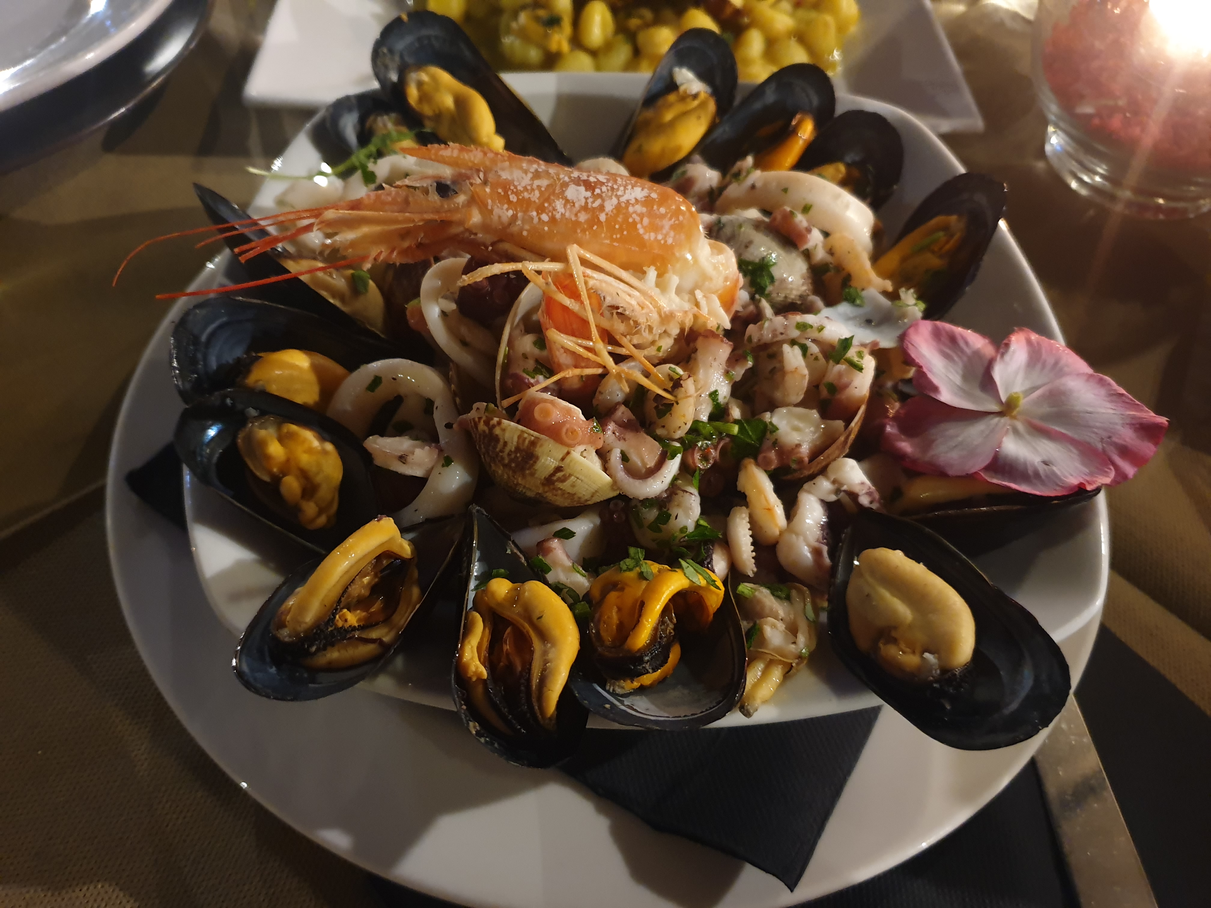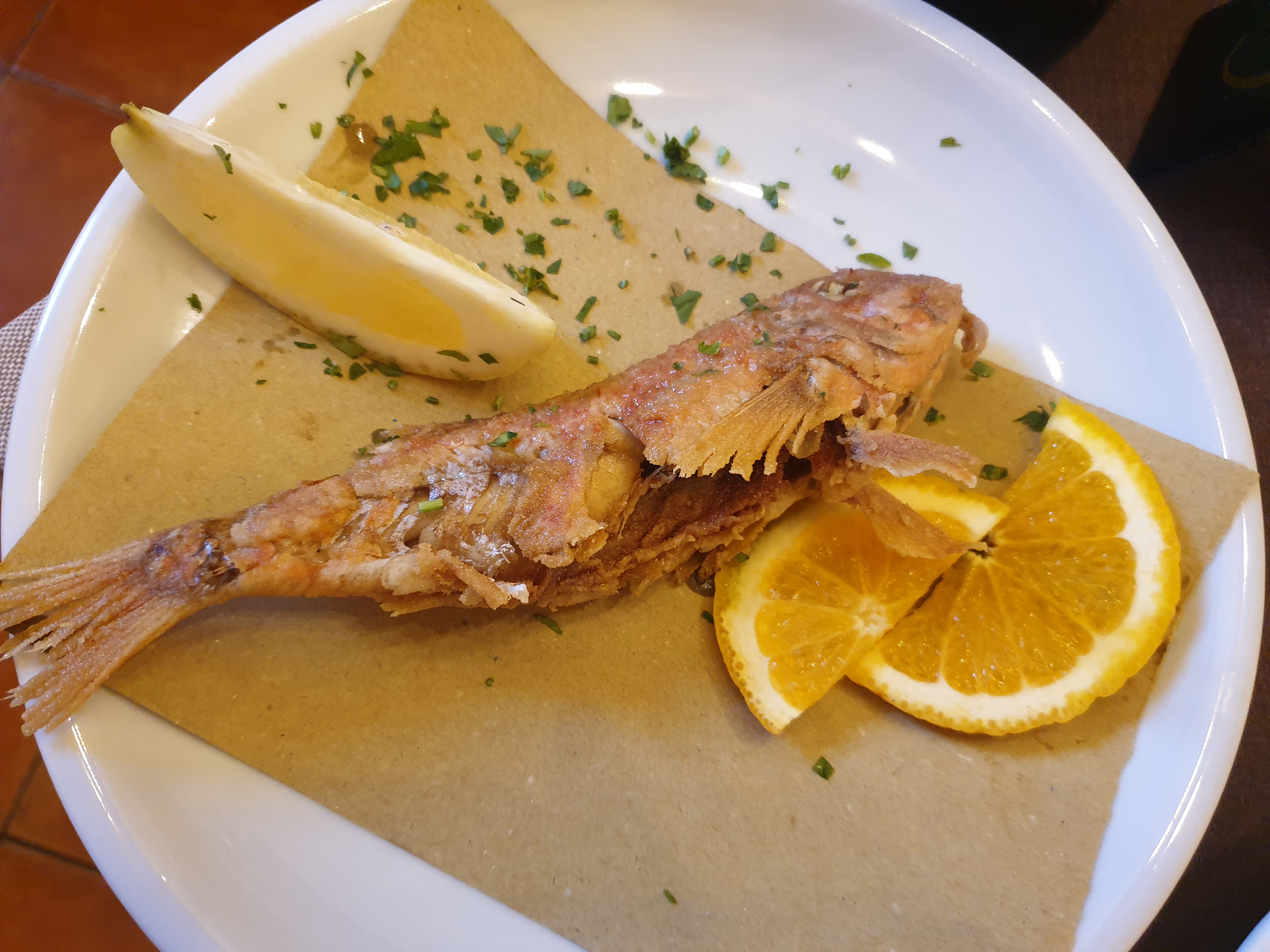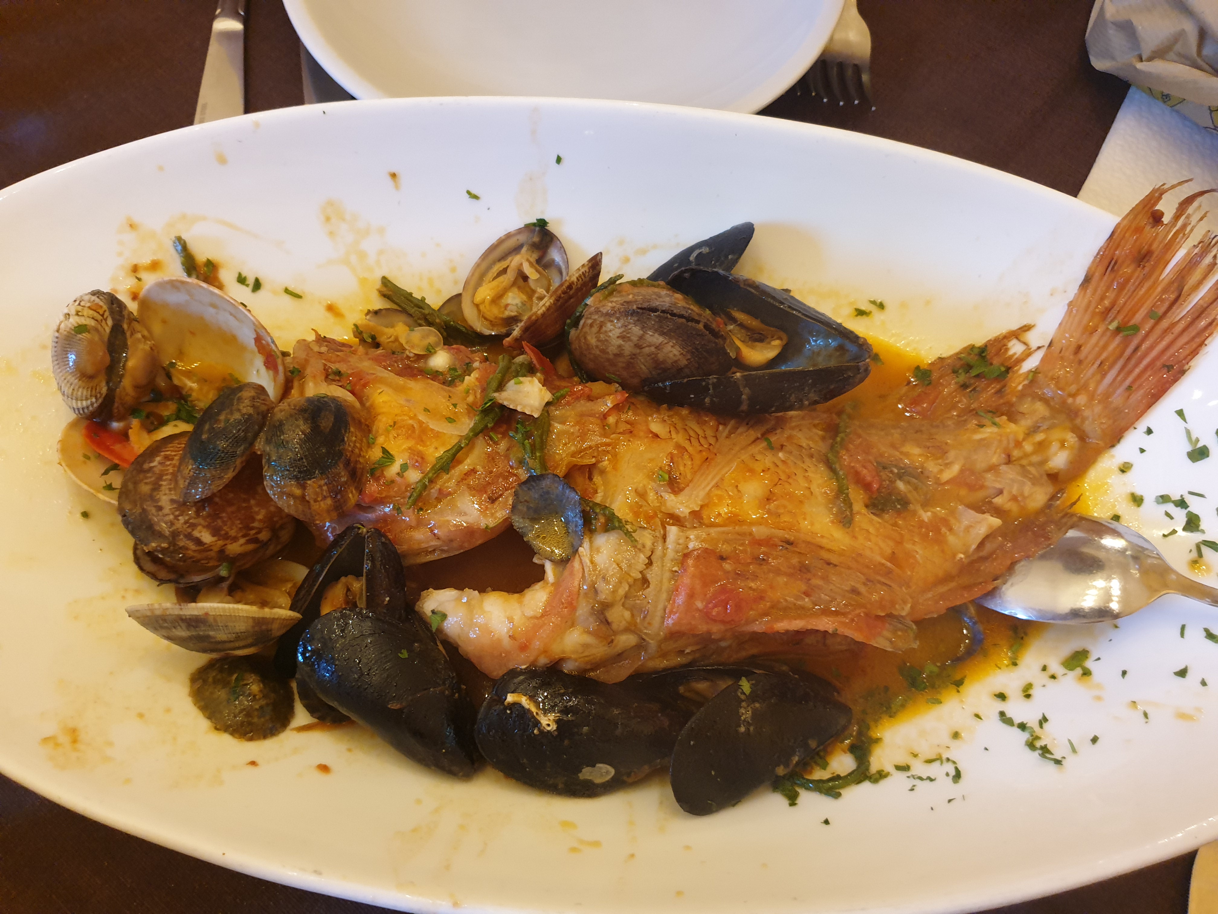 진심 생선 맛집입니다. 가판대에 생선들이 진열되어 있고, 무슨 생선을 먹을지 선택할 수 있어요. 조리 방법 또한 선택 가능한데, 와이프가 작은 생선을 골라 튀겨 달라고 했는데 너무너무 맛있었어요. 무슨 생선인지 조리법도 잘 몰랐지만 큰 생선도 맛있었구요. 여기서도 브루스게따로 시작해주고 후식까지 먹었습니다. 피스타치오로 만든 후식으로 선택했어요.