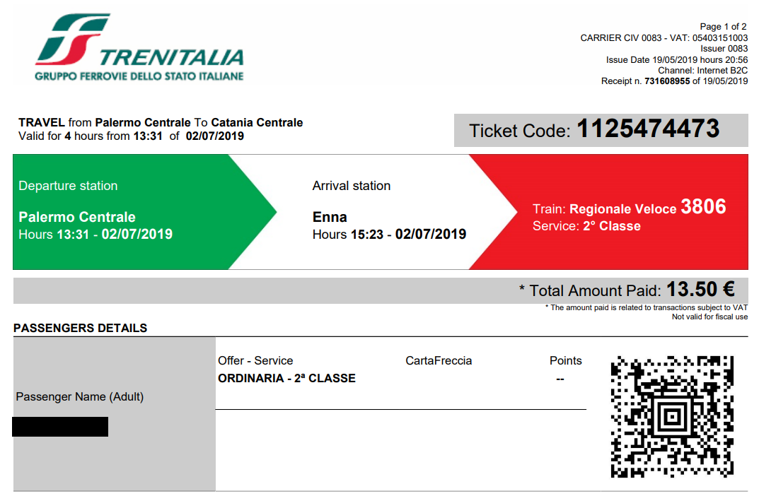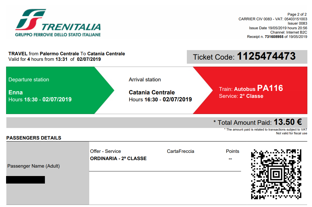 저희는 여행 출발 전부터 Trenitalia 홈페이지를 통해 기차표를 예매해 두었어요. 티켓은 총 두장으로 구성되어 있었는데, 먼저 Palermo Centrale 역에서 기차를 타고 Enna 역까지 향한 후 Enna에서 Catania Centrale로 가는 버스를 탔어요. Enna역에서 자연스럽게 사람들을 따라 나가면 역 바로 앞에 버스가 정차해 있는 것을 발견할 수 있습니다. 버스를 타고 약 50분 정도 이동하면 Catania Centrale 역에 도착할 수 있어요. 여기서 택시를 타고 숙소로 향했어요.