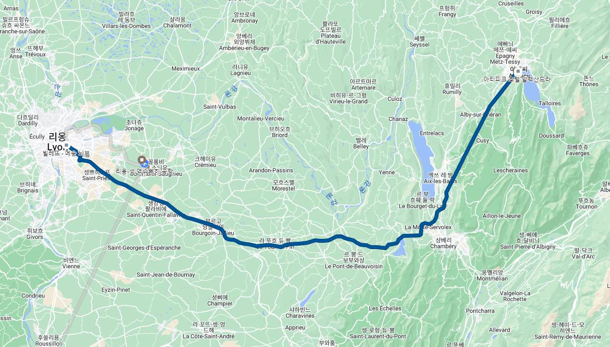 그리고 리옹에서 안시로 하기 루트를 통해 이동해주었어요! 구글 타임라인을 보니 2시간(130km) 걸렸네요. 리옹만 교통이 헬이었고 리옹을 나온 후에는 괜찮았어요.