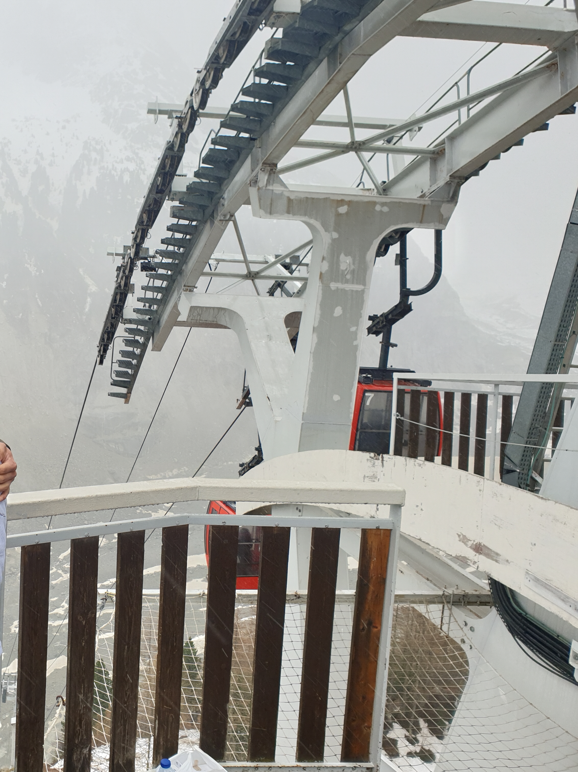 그리고 난간 옆쪽을 보시면 아래 사진과 같이 메르드글라스(Mer De Glace) 라 불리는 얼음 동굴 입구로 향하는 케이블카가 있어요ㅎㅎ 여기까지 왔는데 안 가면 아쉽잖아요 꼭 가줍니다! 천연 빙하인데 후회안해요. 그리고 저는 이날 정말 얼어 죽는줄 알았어요.