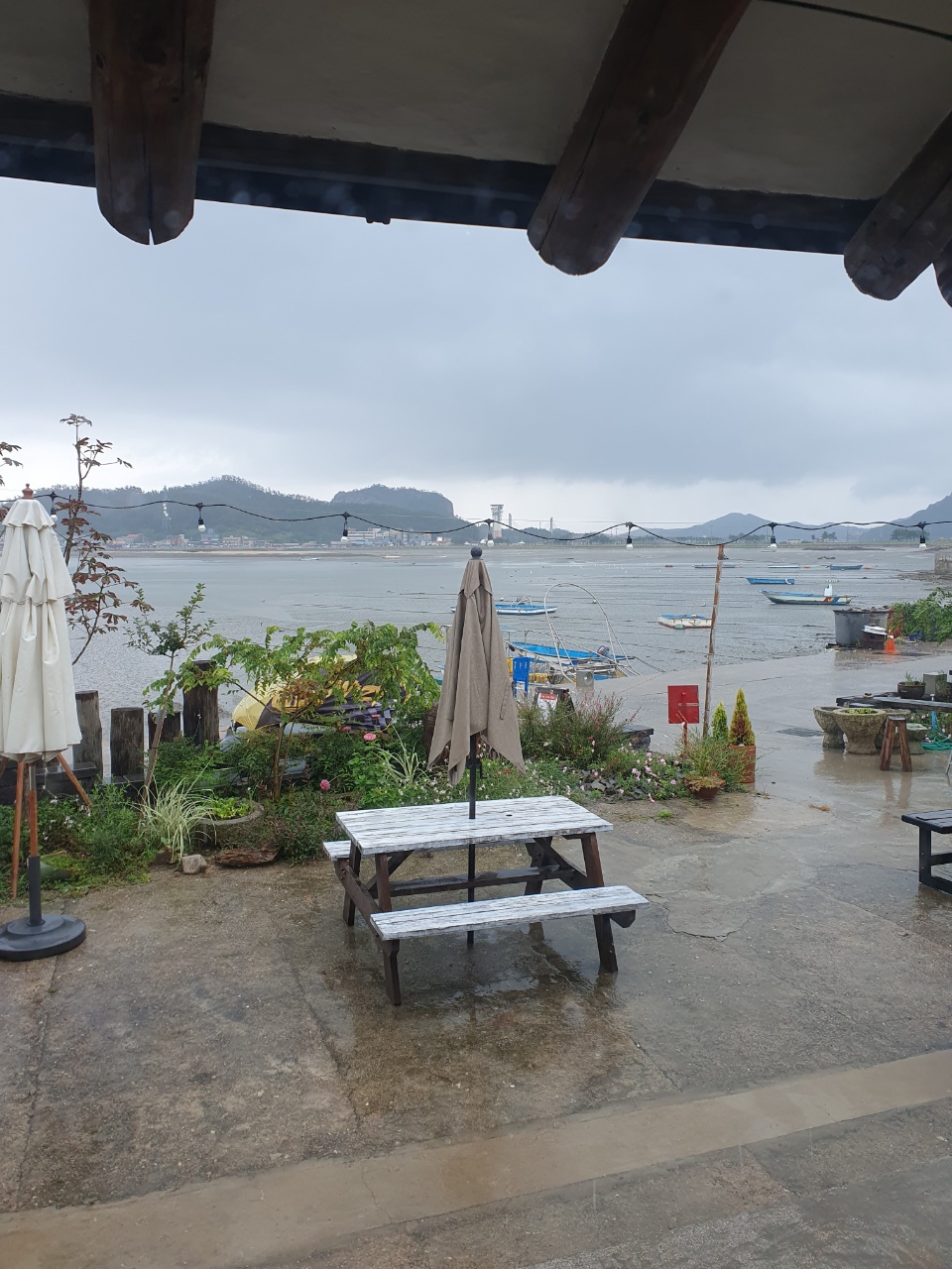 위에 사진은 펜션 앞에 바로 앉아 앞에 바다를 보는 모습입니다. 그런데 생각해보니 이때 선유도에 놀러갔을때도 비가 왔었네요. 비오는 섬은 더 느낌있죠. 앞으로 보이는 바다에 배가 있는 선착장? 지역이라고해서 아쉬워하지 마세요. 왼쪽으로 조금만 걸어가다보면 해변가가 나오거든요. 사진 위로 처마가 보이네요.