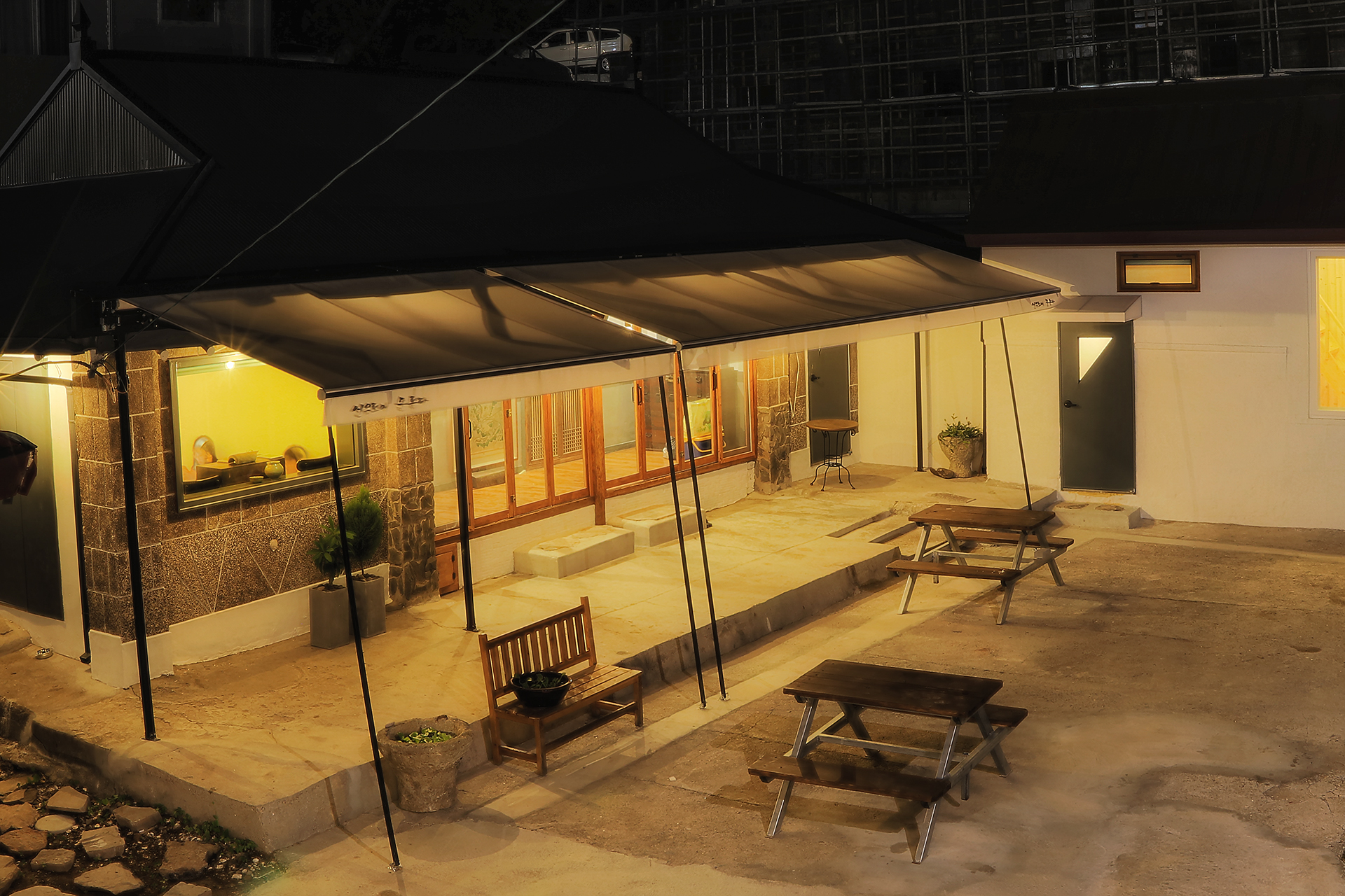 밤에는 또 이 분위기에서 술한잔 해줘야죠, 밤빛머루라는 술을 어디서 사와서 먹었는데 맛 없어서 거의 못먹었어요. 약간 불편한게 먹을걸 사려면 선유도 시내쪽으로 좀 나가야 마트가 있어요. 혹시 예정된 여행이시라면 군산쪽에서 많이많이 사오시길 바랍니다.