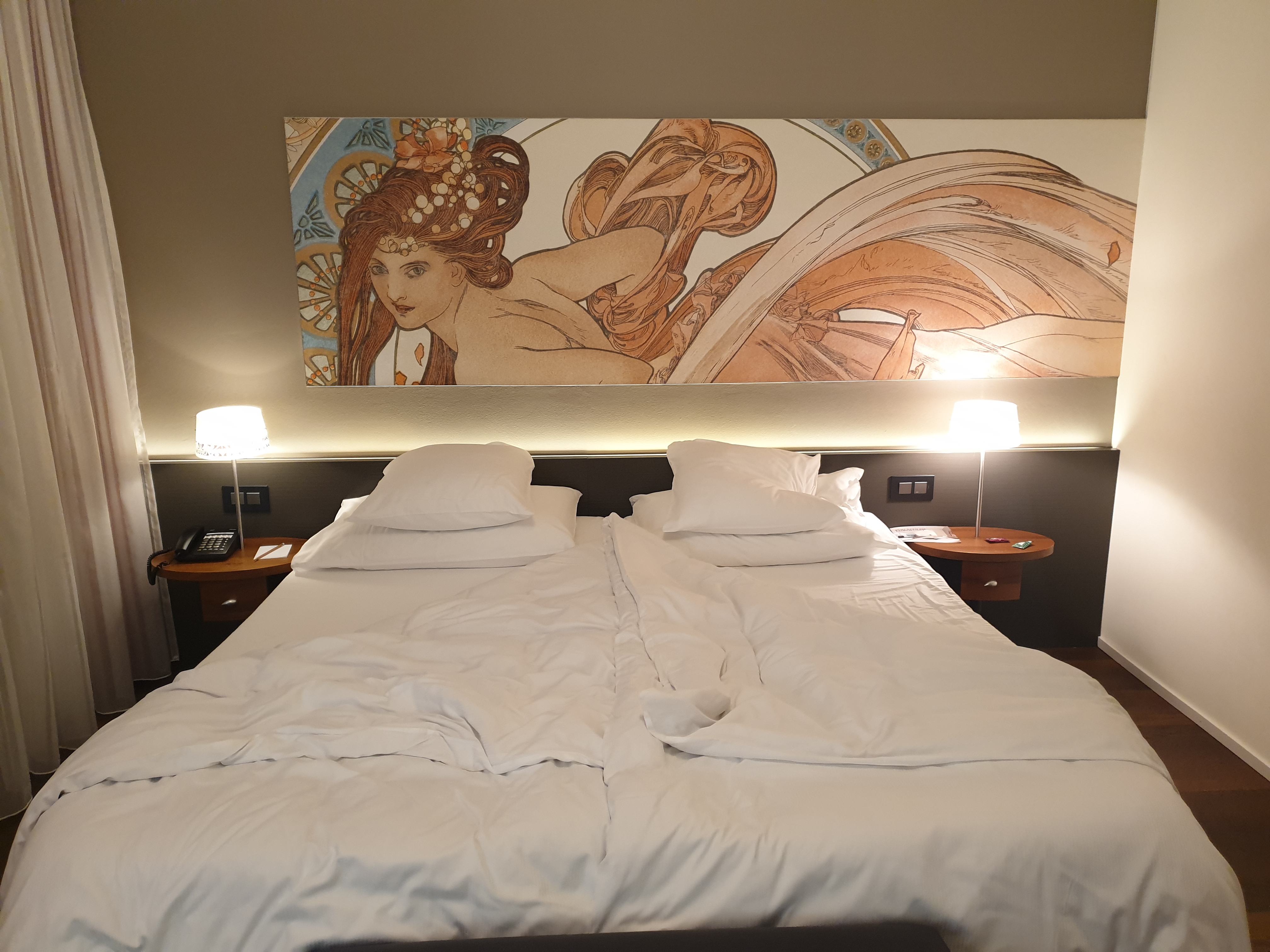호텔의 발코니는 넓고 의자도 있어요. 그리고 눈앞으로 호수와 산맥의 풍경이 펼쳐져요. 침대 뒤에 있는 그림도 인상적이죠, 침대 왼쪽으로 쳐져 있는 흰색 커튼으로 발코니가 바로 이어져 있어요.