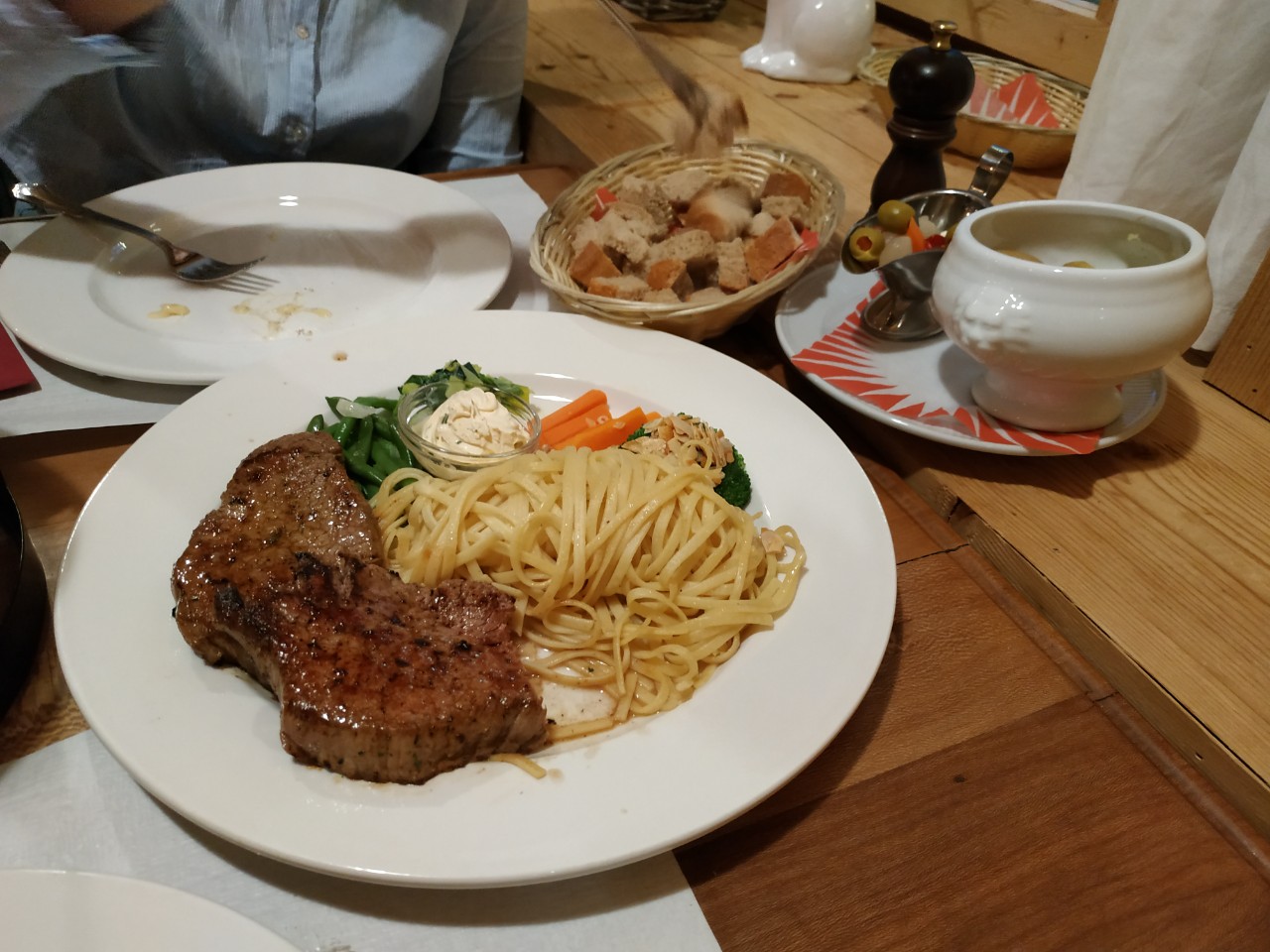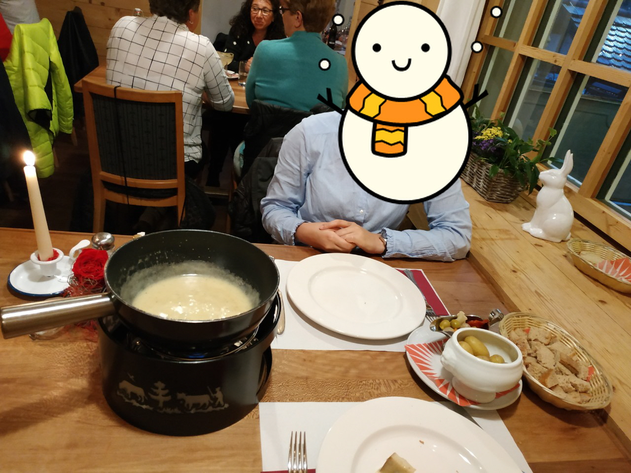 그리고 정말 조금만 더 있으면 스위스에서 얼어죽겠다 싶어 찾아간 퐁듀 맛집이에요. 퐁듀는 원래 스위스에서 얼어붙은 빵을 먹기 위해 치즈를 녹여 빵을 찍어 먹는 것에서부터 시작되었다고 해요. 여기는 갔는데 정말 스위스 아줌마 아저씨들이 저녁 모임 하고 있는 느낌이더라구요. 여러가지 치즈를 녹여 살짝 약한 꼬리꼬리한 맛이 나는데 비위 약한 제가 먹어도 퐁듀는 정말 맛있었어요! 와이프는 염소치즈 포함 못 먹는 치즈가 없어 이미 퐁듀에 현혹되어 있었구요. 요 치즈에 빵, 작은 감자, 채소류 등을 찍어 먹는데 진짜 엄청 맛있습니다. 스위스 중세시대 산악인이 되어보고 싶어요. 같이 시킨 스파게티도 약간 저는 터미널에서 파는 한국 칼국수 식감이었어요. 역시 맛있었죠. 스테이크는 항상 옳구요. 체력을 많이 쏟아 아포가토 같은 후식까지 먹었구요. 와이프가 밥 먹으면서 했던 감탄사가 멀리서 메아리처럼 들려오는 것 같아요.