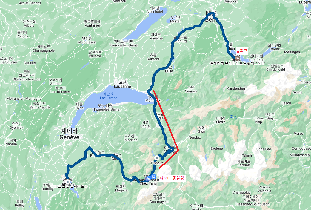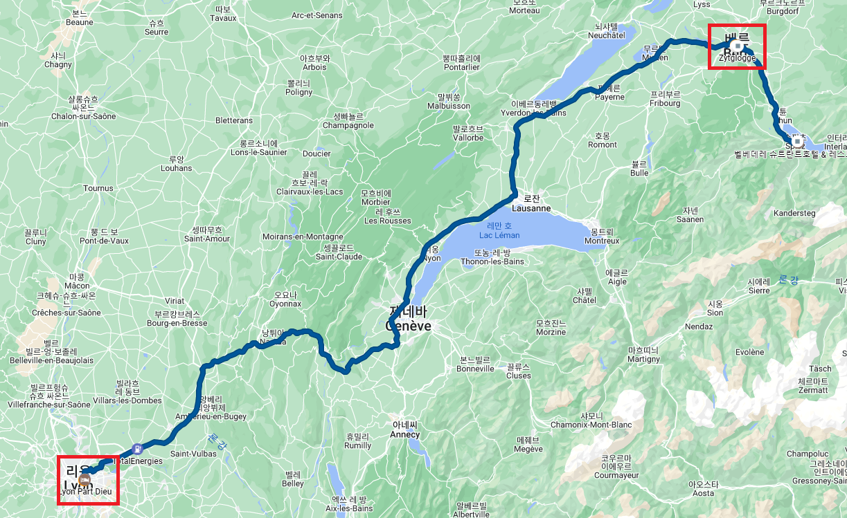 오늘은 저번 프랑스 동부 여행에 이어 스위스로 넘어 갔던 기억을 남겨보려해요. 프랑스 샤모니 몽블랑에서 저녁 6시30분쯤 모든 일정을 마치고 렌트카를 타고 인터라켄 바로 옆쪽에 있는 도시 슈피츠로 향했어요. 스위스로 들어가기 전 고속도로 스티커를 구매해서 자동차에 부착해 주시구요. 그리고 정말.. 아래 지도에 표시해 둔 빨간색 루트가 태어나서 절대 잊을 수 없는 현재까지 제 생애 최고의 드라이브 코스였어요. 일단 숲길을 달리는데 앞뒤로 차가 없었어요. 해도 길어 저녁에 운전했지만 날이 밝았어요. 프랑스에서 스위스 국경으로 넘어가는 순간 산 속에 작은 가게가 하나 있는데 카나비스 관련된 제품들을 팔더라구요. 물론 저희는 구경만 했지만요. 그리고 산을 다 넘어 내려오는 구간이 있는데, 산골 사이의 스위스 마을이 보이면서 지도상 보이는 레만 호가 넓게 펼쳐져요. 더하여 하늘 높이 보이는 웅장한 구름과 구름 사이로 감춰지지 않는 햇살, 거기에 배경을 이루는 풍력발전의 모습이 장관을 이루어요. 다시 한번 꼭 가보고 싶은 루트에요. 그리고 저희가 유명한 관광지인 인터라켄에서 조금 떨어진 슈피츠(Spiez)를 숙박지로 잡았던 가장 큰 이유는 그 곳에 가격도 그나마 괜찮고 가장 마음에 드는 호텔이 있었기 때문이에요. 샤모니 몽블랑에서 슈피츠까지 약 2시간 50분을 달려 도착할때 쯤에는 약간 어둑어둑한 상태였어요. 밤 10시 정도 되어 배가 너무 고픈 상태였지요.