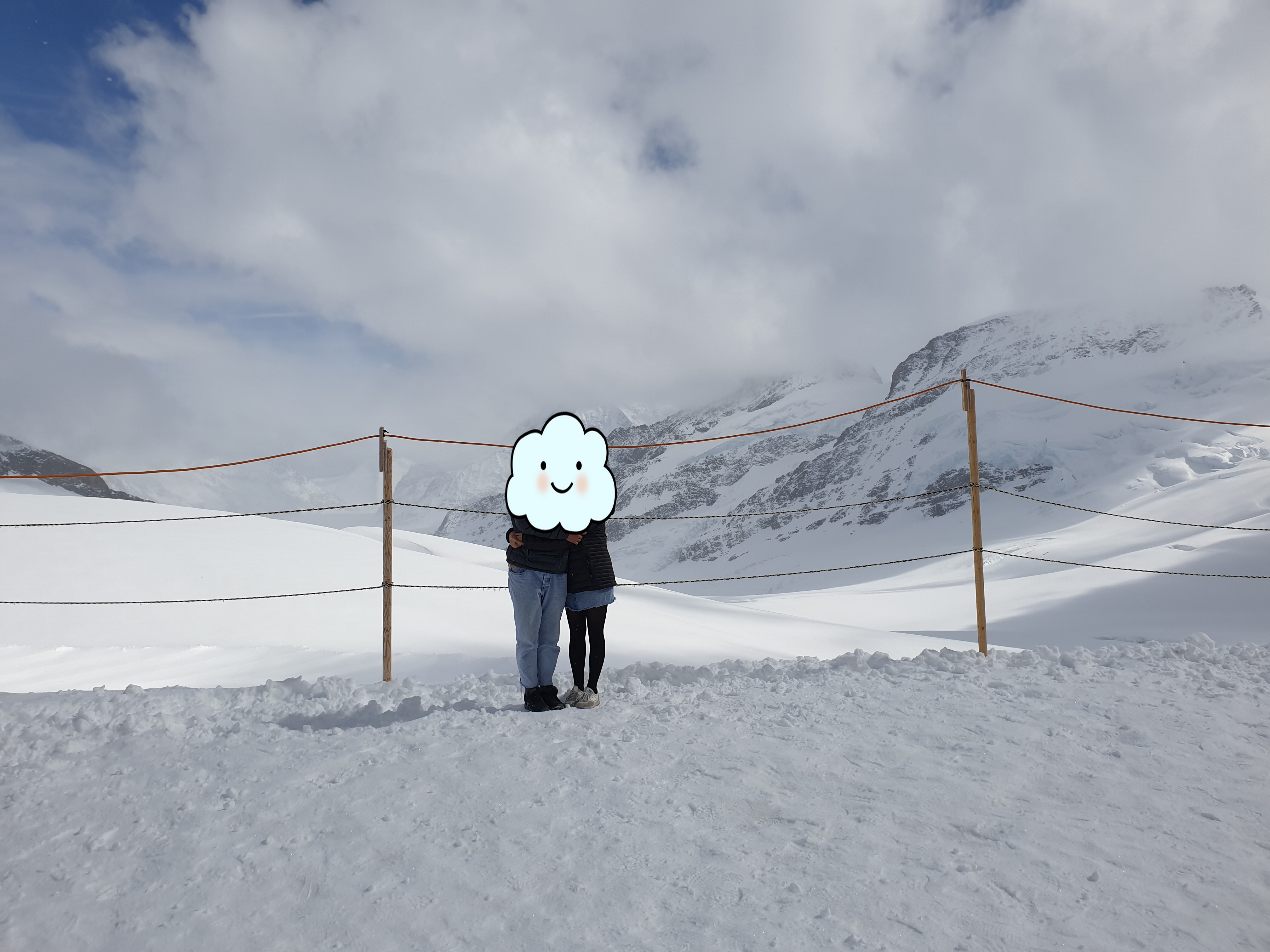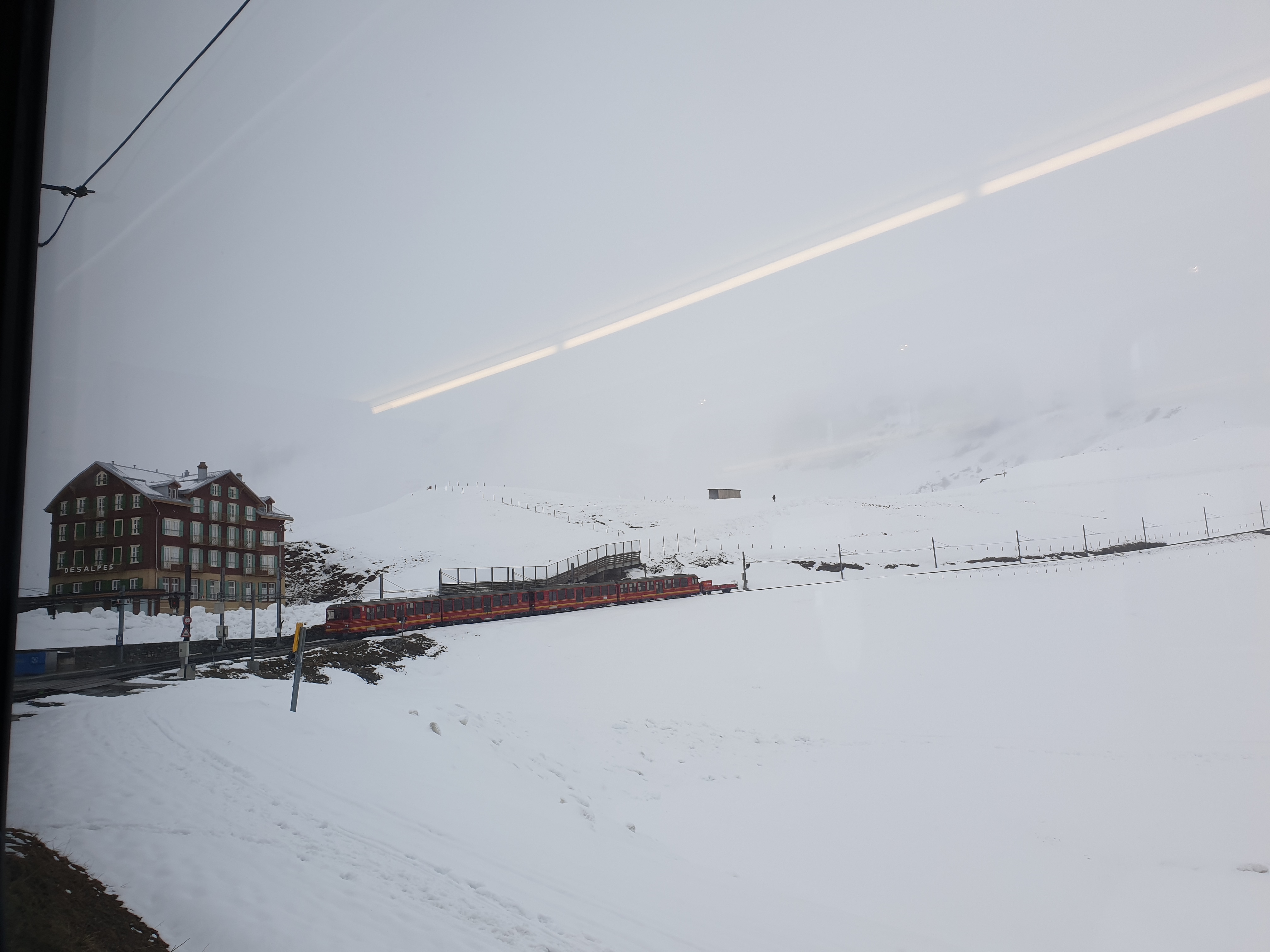 그린델발트에서 융프라우로 향하면서 눈발이 매우 거세졌어요. 마치 다른 지역을 온 것만 같은 느낌이었죠. 저희는 진짜 간도 크게 추위에 크게 대비하지 않고 샤모니 몽블랑에서 샀던 파타고니아 경량패딩에만 의존한채 올라갔는데 약간 계속 떨고 있었던것 같아요. 안에는 최대한 껴입으려 노력했구요. 기차 내부는 그래도 매우 따뜻해서 다행이었어요. 트래킹도 가능한 것 같았는데 다음번에 꼭 트래킹으로 시도해봐야죠. 그리고 저는 고산 지대에 매우 약하더라구요. 계속계속 어지러웠는데 와이프는 괜찮아 보이더라구요. 융프라우는 내부 건물에 시설이 잘 되어있어 돌아다니며 놀기 좋았어요.