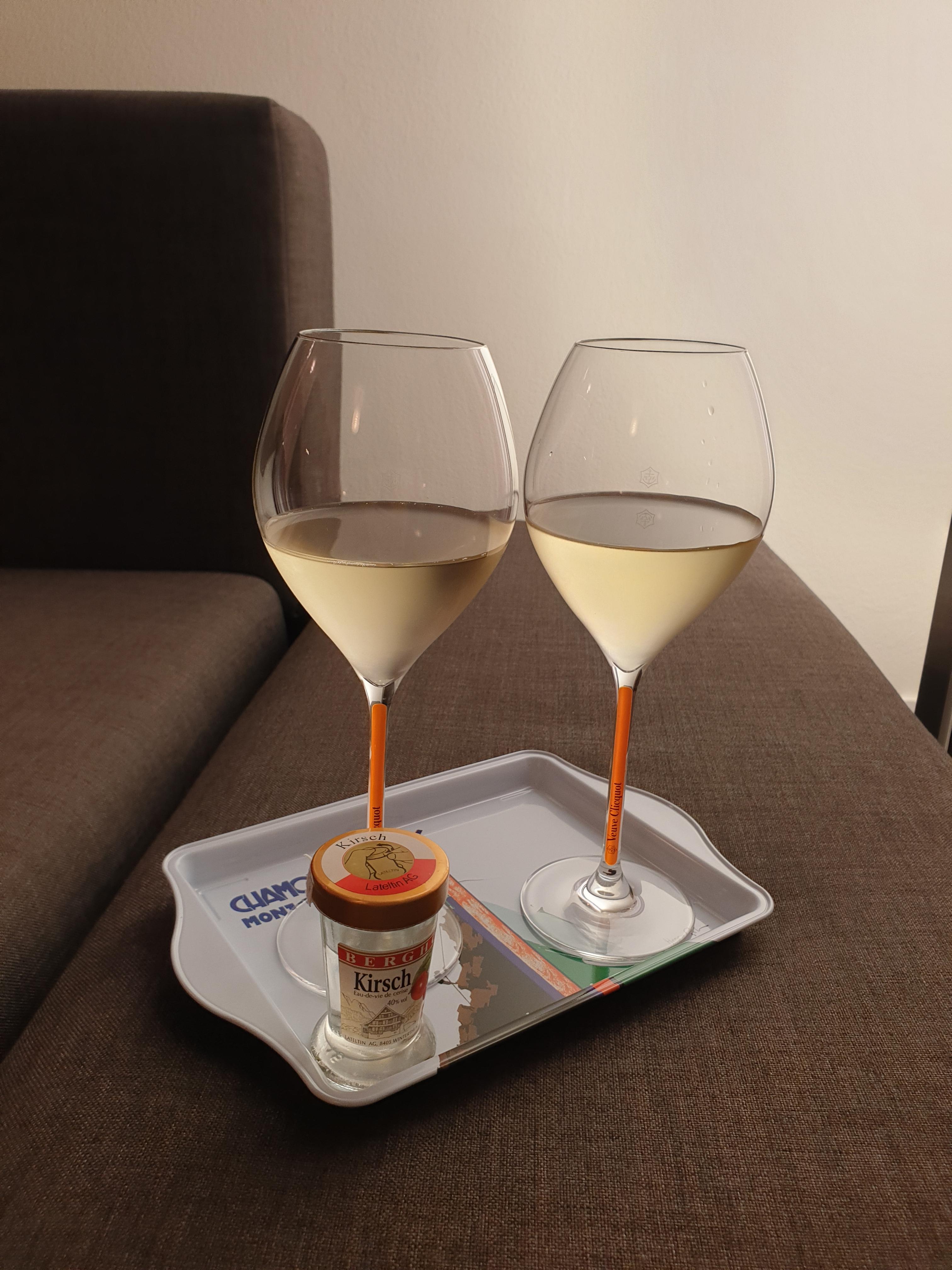 첫 날 도착해서 저녁밥은 못 먹고 빈속에 냉장고에 있는 Spiez 와인을 꺼내 먹었어요. 그리고 여러 종류의 Liquor 같은게 있었어서 먹었는데, 사진에 있는 키르슈바서(Kirsch)는 증류주의 일종으로 체리류를 발효해서 만든다고 하네요. 그래서 병에 체리? 산딸기 같은 그림이 붙어있었나봐요. 쟁반은 몽블랑에서 사왔던 기념품이에요.