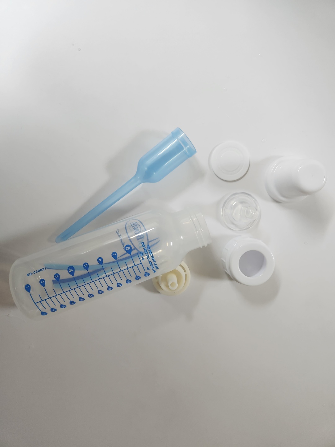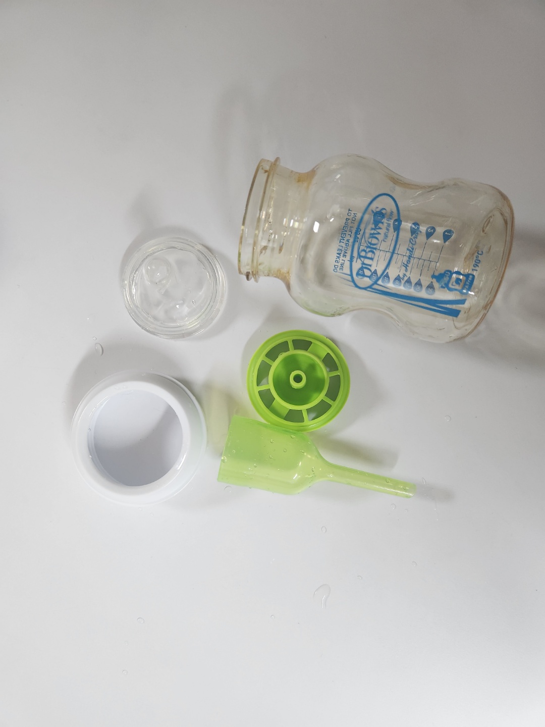 아래 사진이 150ml 사이즈 닥터브라운 젖병이에요. 부속품이 많죠. 아직도 이 젖병이 배앓이를 방지하는 정확한 이유는 잘 모르겠으나, 추측으로는 다른 젖병보다 외부의 공기가 젖병 내부로 훨씬 잘 들어오도록 만들어져 있는 것 같아요. 아기가 젖병을 빠는데 외부의 공기가 내부로 잘 안들어와 내부의 압력이 작아지면 분유가 안나오고 아기가 외부 공기를 빨게 될테지만, 닥터브라운은 외부의 공기가 내부로 잘 들어오게 만듦으로써 아기의 입으로 분유가 쭉쭉 들어가는 효과를 주는것 같아요. 물론 이때도 젖병을 잘 물리고 아기가 공기 먹는 소리가 안나는지 유심히 들어야지요.