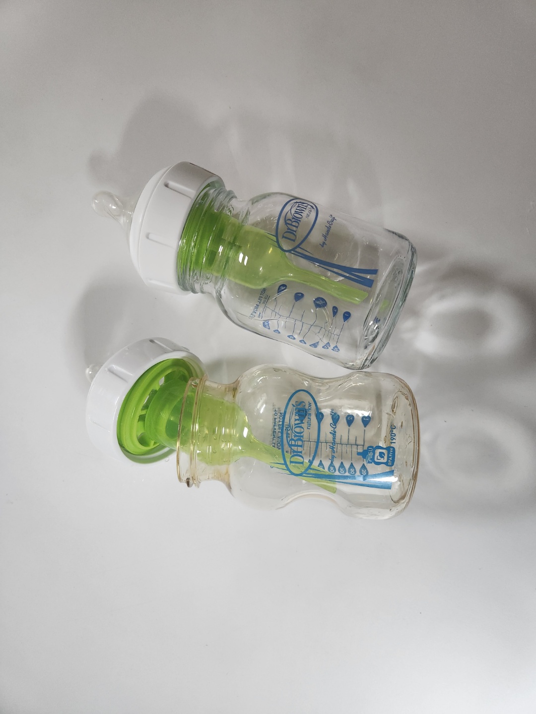 밑에 사진은 150ml 짜리 유리병과 플라스틱병이에요. 플라스틱병이 좀 더 색깔이 어두워요. 야간 수유할때는 유리병 너무 무거워서 플라스틱병에만 손이 가더라구요. 생각해보니 젖병 무게를 따질 정도로 육아가 빡셌군요.