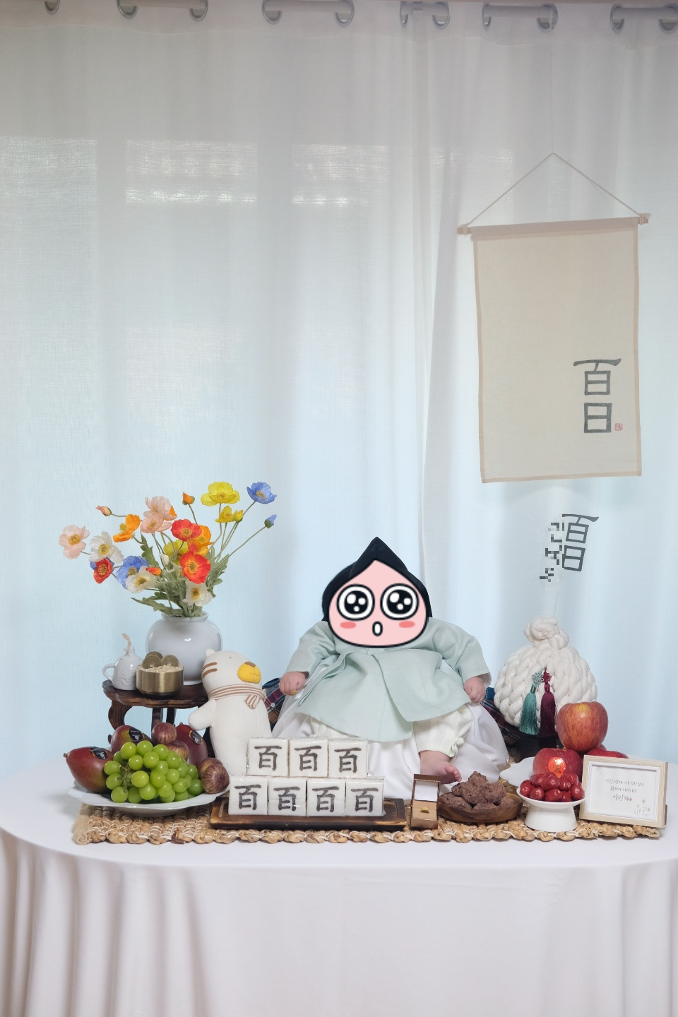 그리고 이번에 저희 약간 맥시멀리스트 같다고 느낀게 떡 놓고, 돌반지 놓고, 덕담 액자 같은거 올리고, 곰돌이 애착인형 올리고 100일상을 그득그득 채우게 되더라구요.