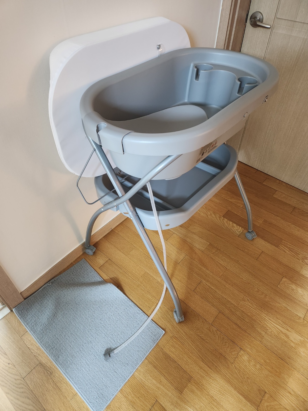 그리고 아기를 씻기는 욕조에요!. 아기를 안정적으로 눕힐수 있는 의자가 있어요. 분리도 가능하구요. 목욕을 다시키고 마개를 열면 물이 호스를 따라 빠져 나가요. 위의 사진에 호스도 보이시죠. 여기에 씻기고 보면 생각보다 아기 머리카락이 많이 빠지더라구요. 태어나면서 있었던 머리카락이 많이 빠지나봐요.