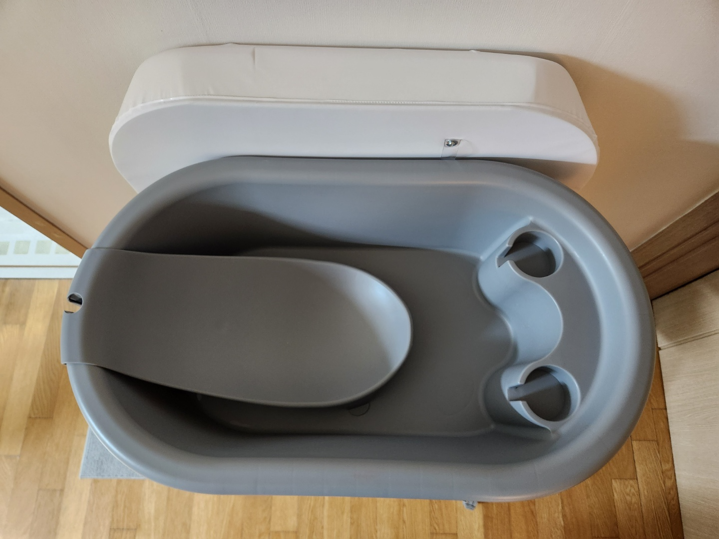 기저귀 갈이대를 옆으로 내리면 욕조로 사용할 수 있어요. 저는 지금 일부러 기저귀 갈이대를 분해해서 아래 사진과 같이 걸쳐 두었는데요, 연결되어 있는 상태로 기저귀 갈이대를 내리면, 욕조 옆 아래쪽으로 딱 밀착되어 안정적으로 내려옵니다.