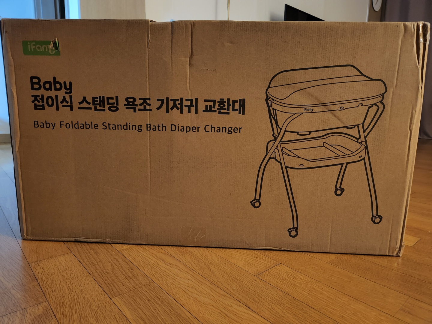 사실 저는 위에 대야 사용하는게 편했어요. 그냥 화장실에 쭈그려 앉아서 벽에 등 기대고 하면 안정적이었거든요. 쭈그려 앉은 허벅지 위에서 애기 옷도 벗기고 그랬어요. 그런데 와이프는 쭈그려 앉아 씻기면 허리가 너무 아프다 그러더라구요. 그래서 와이프를 위해 그리고 아기를 위해 스탠딩 욕조 하나 장만했어요. 이름하여 아이팜 접이식 스탠딩 욕조 기저귀 교환대! 대략 110000원 정도 했었어요.