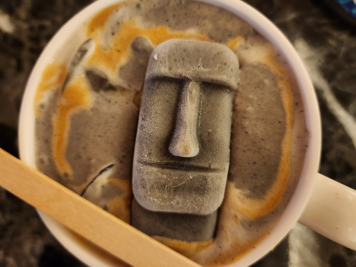 그리고 시멘트커피! 모아이 얼음이 올라가 있는데 약간 검은깨 맛인것 같더라구요. 이것도 진짜진짜 맛있어요. 사진만 봤는데 또 먹고 싶네요. 일단 잔이 나오는 순간 사진 찍게 되고, 한입 먹고 감탄합니다. 모아이 얼굴 참 편하게 생겼네요.