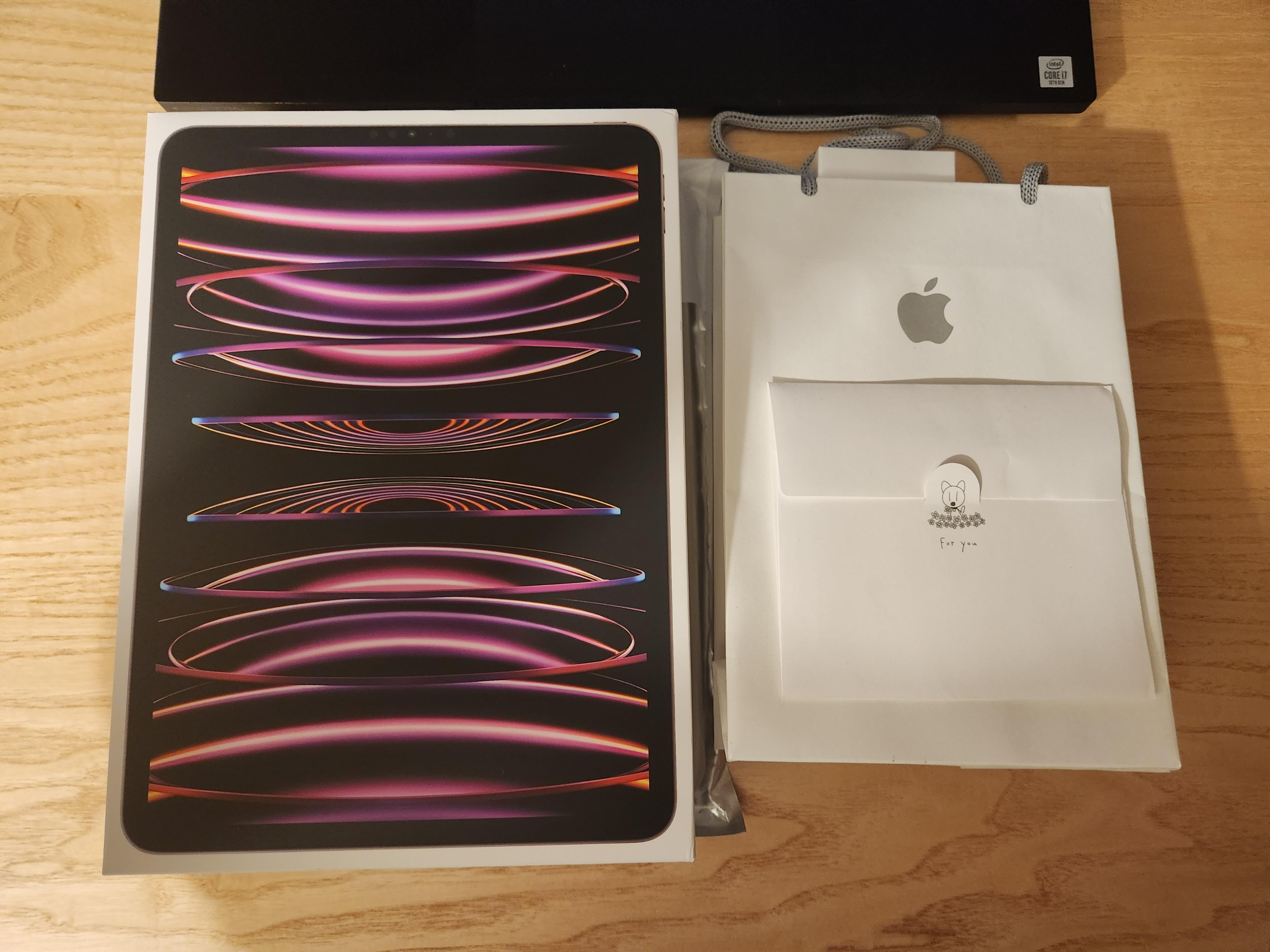 확실히 애플은 케이스, 쇼핑백 다 너무 예뻐요. 근데 가격은 좀 너무 사악한것 같아요. 용량 좀 더 넉넉하고 저렴하게 해줄 수 있을 것 같은데.. 용량 늘리고 사이즈 작게 하는게 힘든 걸까요? 와이프가 선물해 주기 전에 유튜브로 9세대, 에어, 미니 등등 아이패드 리뷰를 쭉 보았는데 결국 프로로 귀결하게 되었어요.