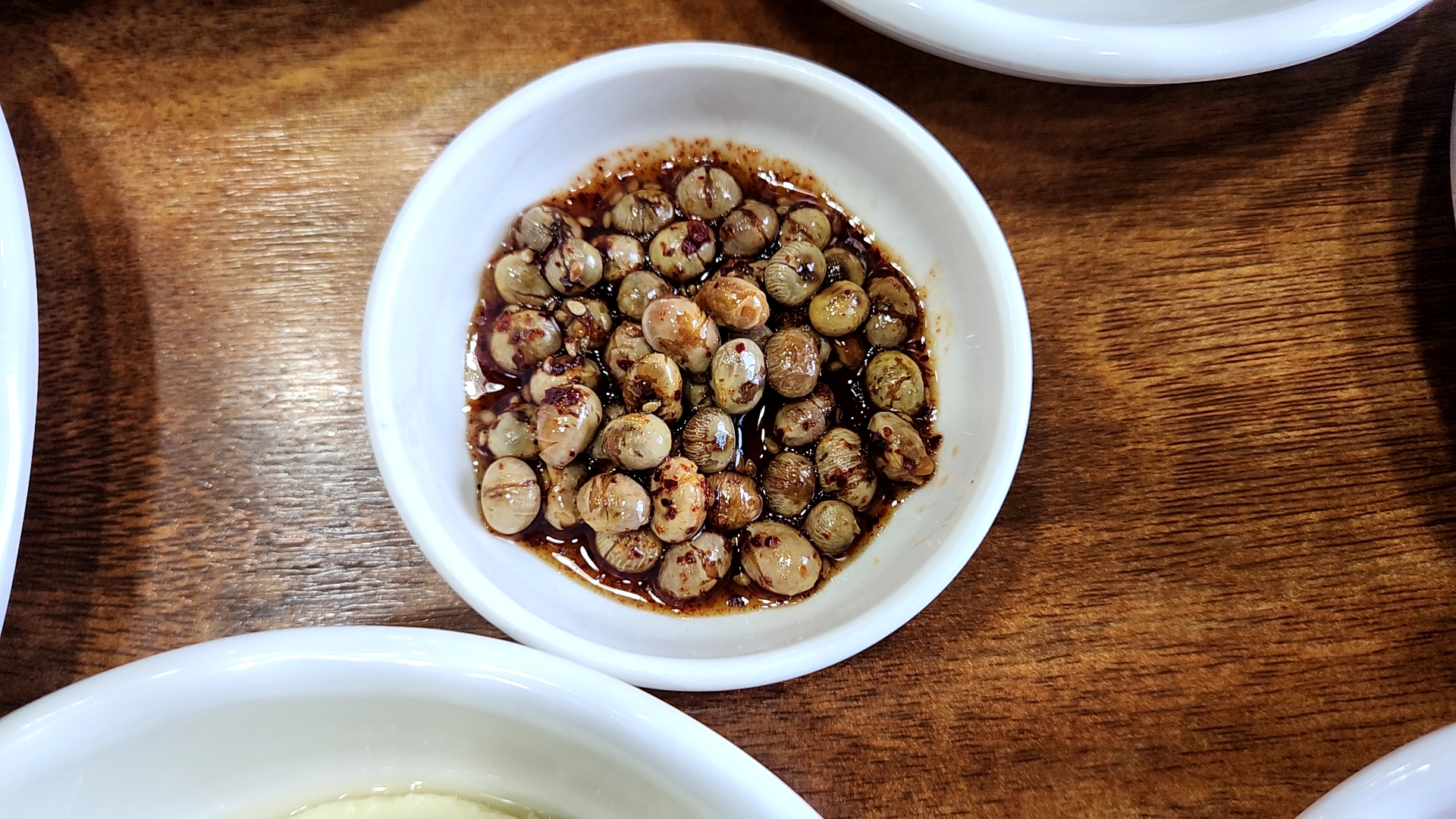먼저 밑반찬이 세팅되어요. 가자미 구이도 맛있고 메주콩도 맛있고 계란찜도 맛있어요. 메주콩 먹다 이빨 안나가게 조심해야 합니다.