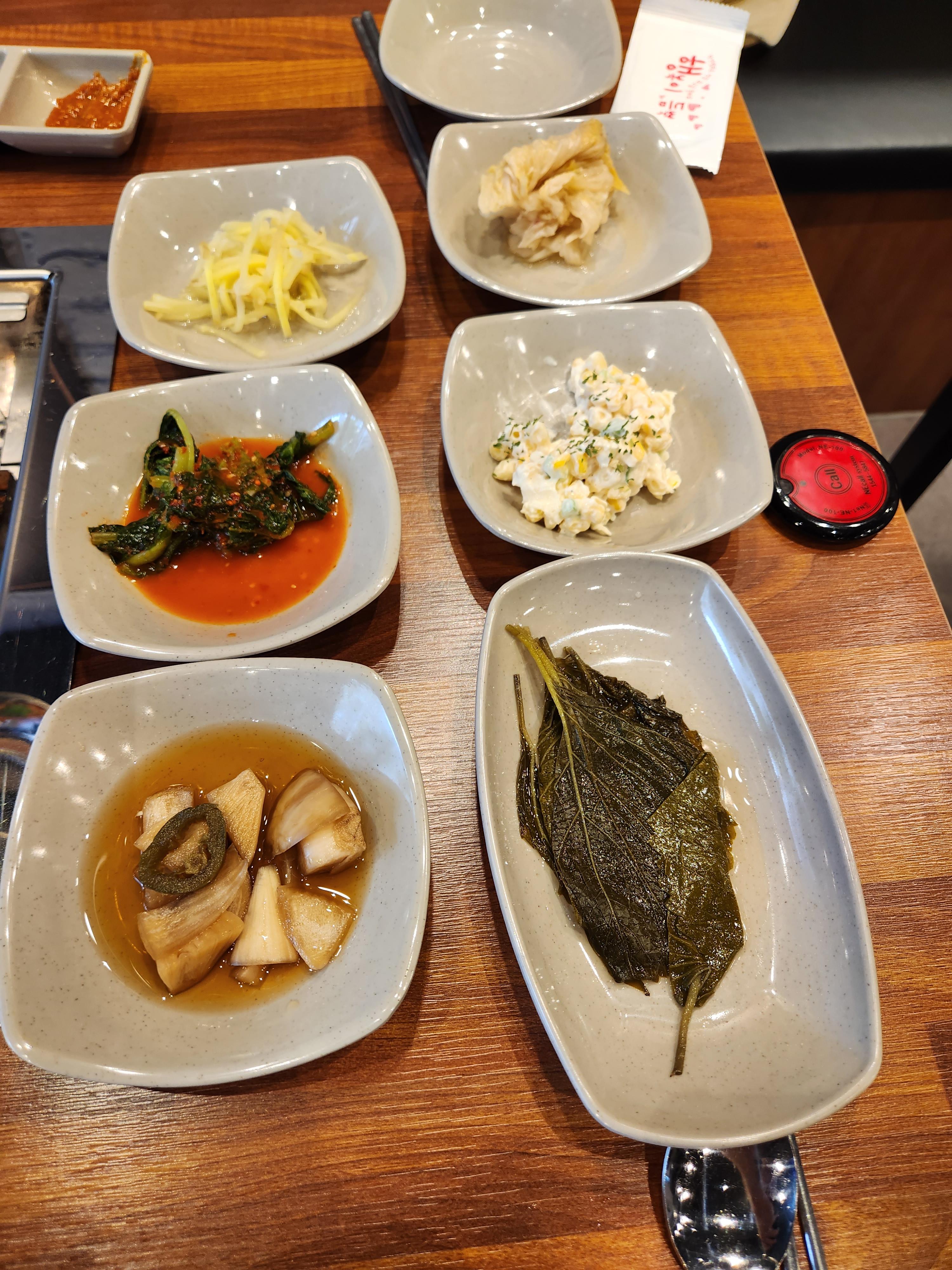 밑반찬이 세팅되었어요. 사진외에 쌈채소도 있었고 카메라에 안 담긴 것도 있었던 것 같아요. 사라다랑 반찬들이 다 맛있었어요. 주문 받아주시는 사장님?같으신 분도 무척 친절하셨구요. 맛도 깔끔