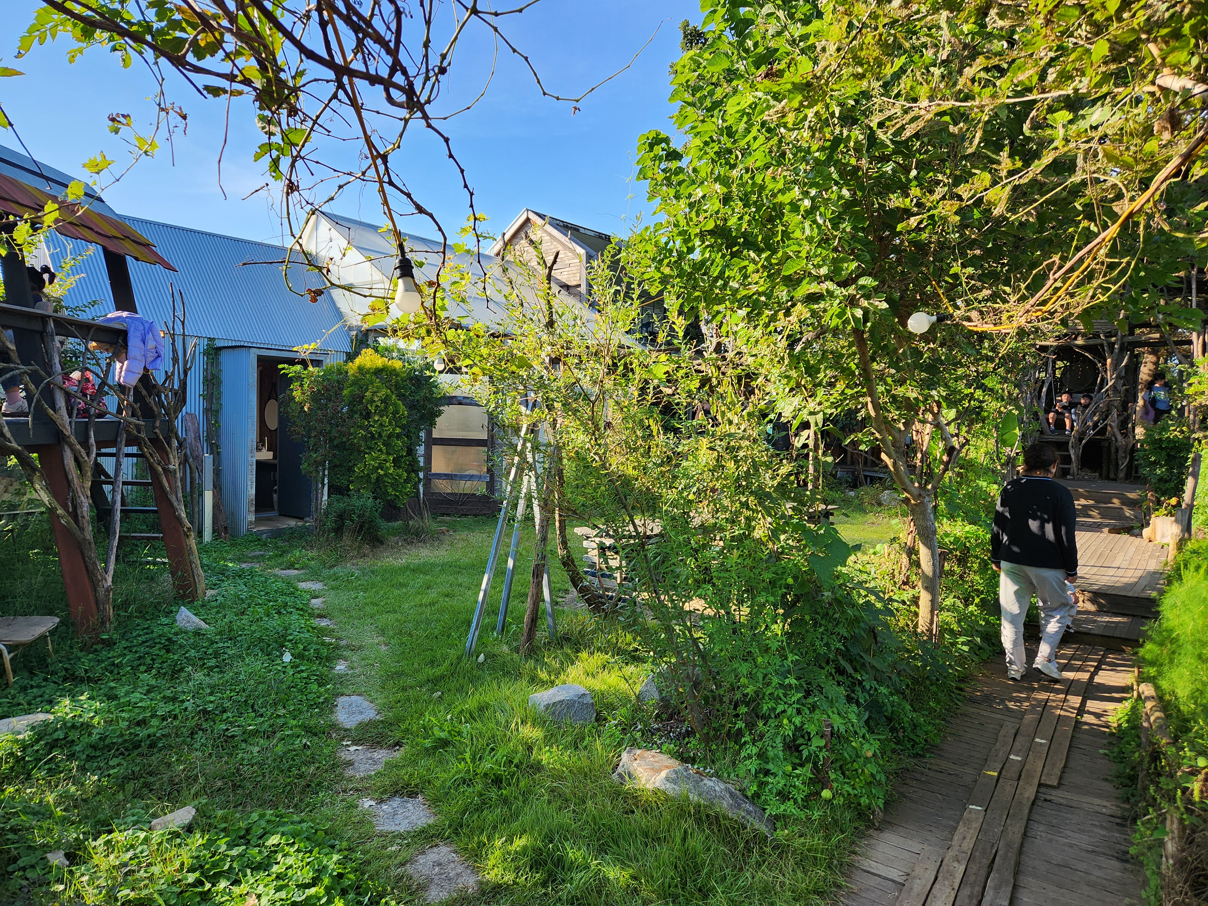 나무집 입구를 지나가면 아래 사진과 같은 정원공간이 나와요. 여기에도 커피를 마실수있는 테이블이 있고, 야외 별관 같은곳도 있어서 그곳에서도 커피를 먹을 수 있어요. 동화같은 곳이에요. 한쪽에는 닭들도 키우고 있더라구요.