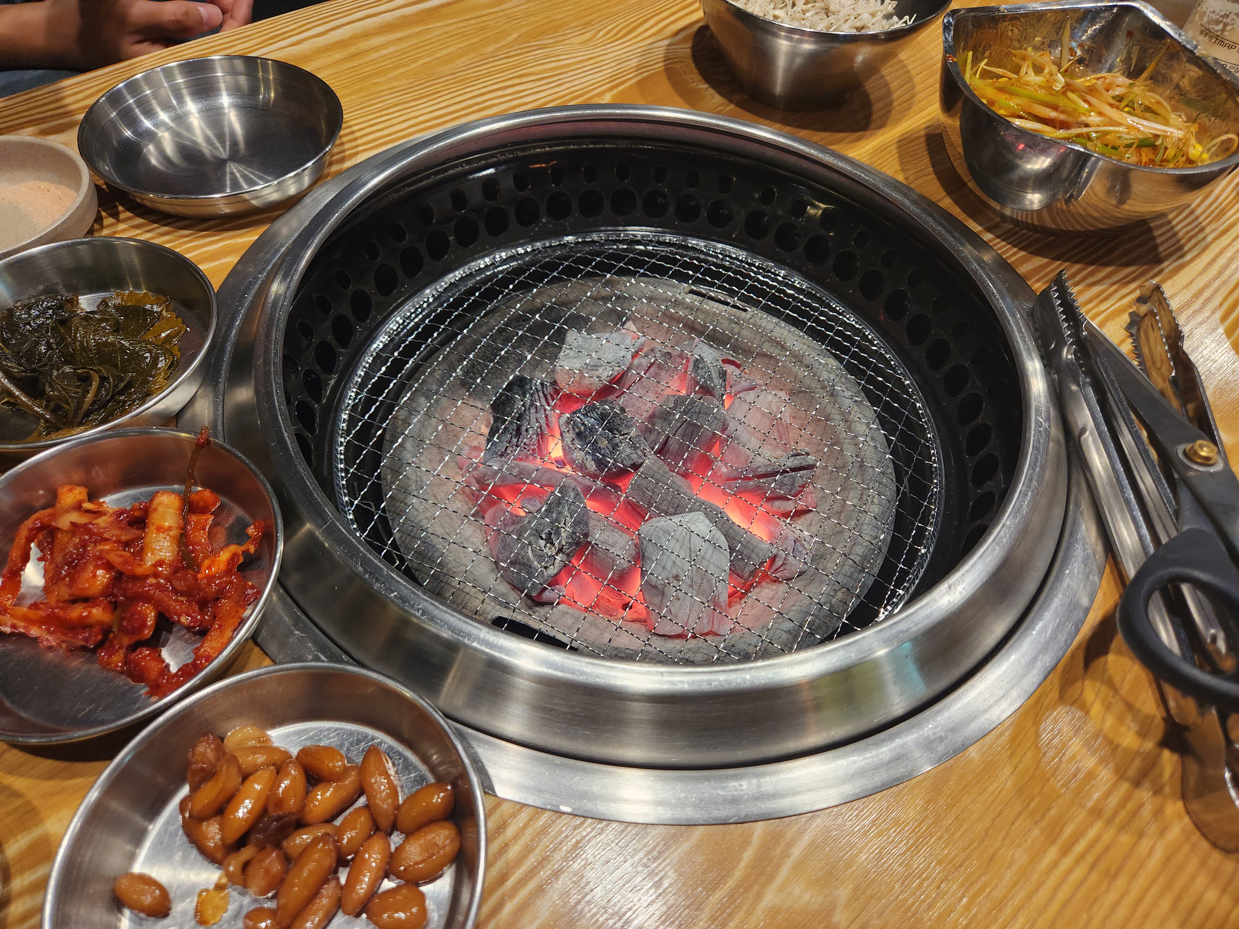 소고기에 숯불은 최고죠. 한 가지 아쉬운점은 구워주는 곳으로 가고 싶었는데 여긴 저희가 직접 구워 먹는 곳이었어요. 반찬은 크게 기억나는건 없었어요.