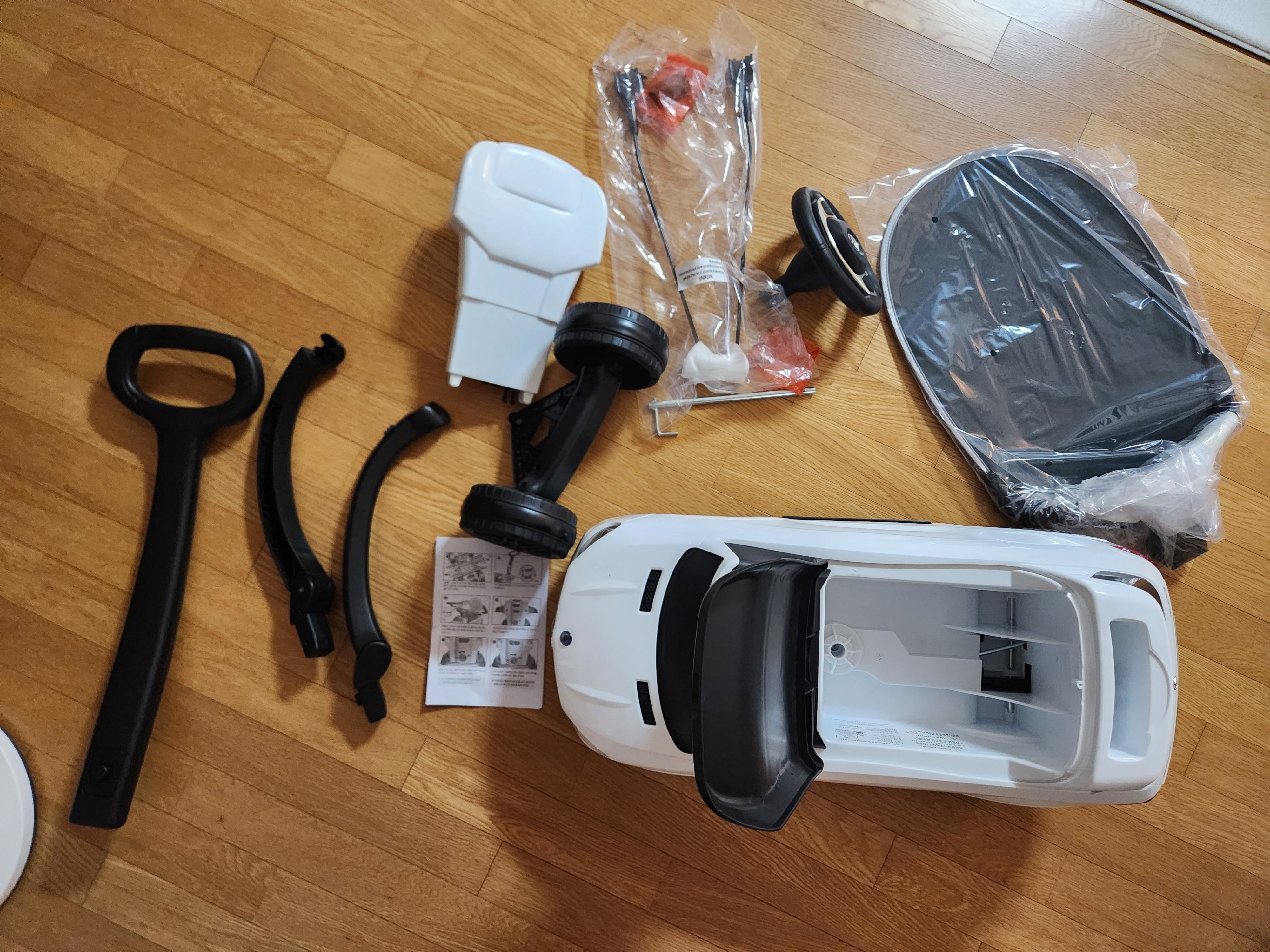 부품은 아래처럼 있어요. 의자 위로 열면 의자 아래 핸들이 있더라구요. 아기가 자고 있을때 내일 깜짝으로 보여주기 위해 재빠르게 만들고 숨겨 놓기로 했어요. 옆에 아기가 있으면 호기심 충만해해서 만들기 너무 어려워요. 작은 나사 같은것도 있고해서 위험할것 같아요. 그리고 만들어 놓은거 밤에 보여주면 각성해서 못 자더라구요.. 아침에 아기 체력 충만할때 보여주고 체력 쏟게 만드는 전략입니다.