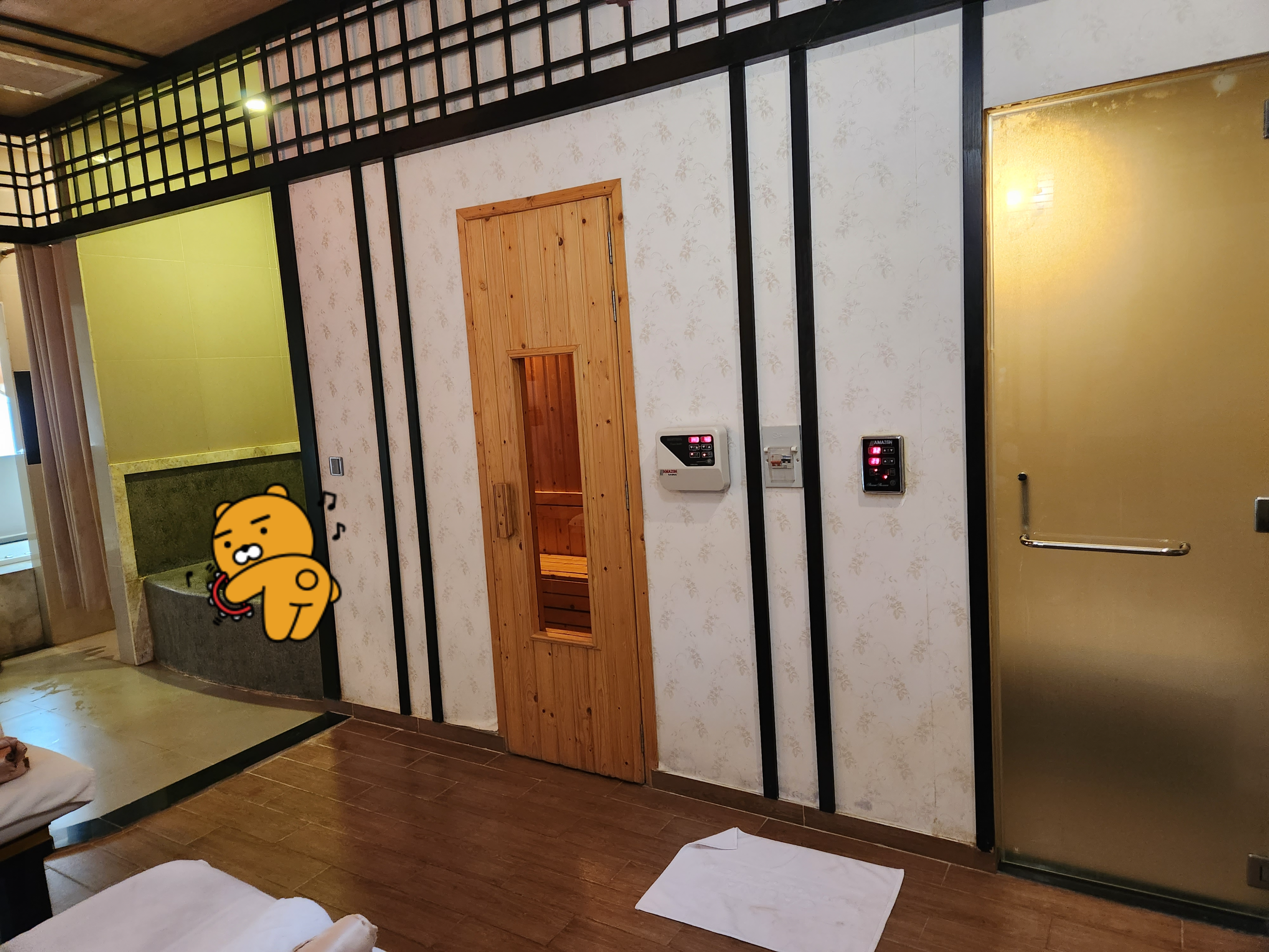 마사지가 끝나면 거품이 나오는 욕조에서 몸을 씻고, 아래 사진 가운데처럼 찜질방과 오른쪽의 습식스파를 즐길 수 있어요.