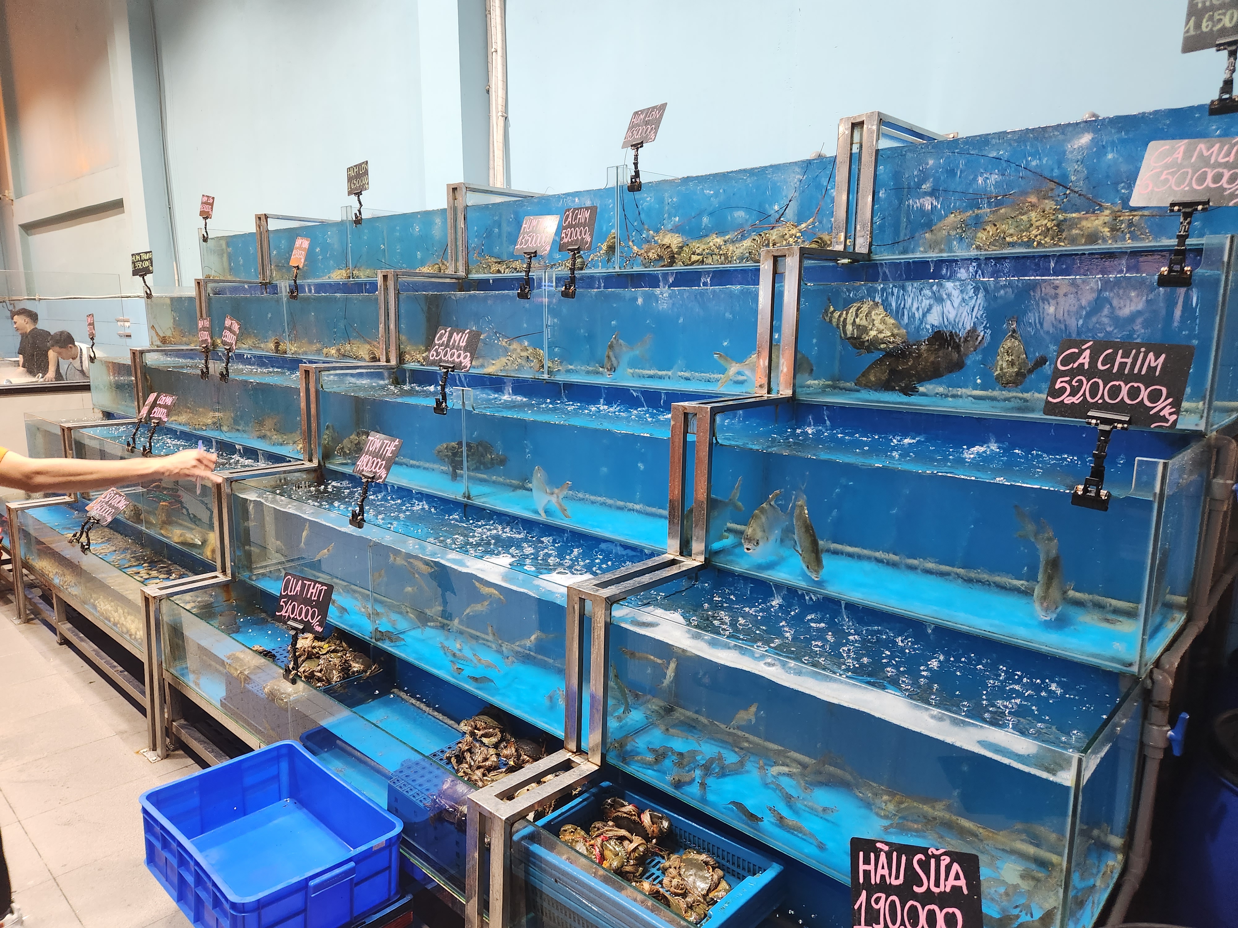 여기는 수족관에 있는 음식을 저희가 직접 선택하여 먹을 수 있어요.