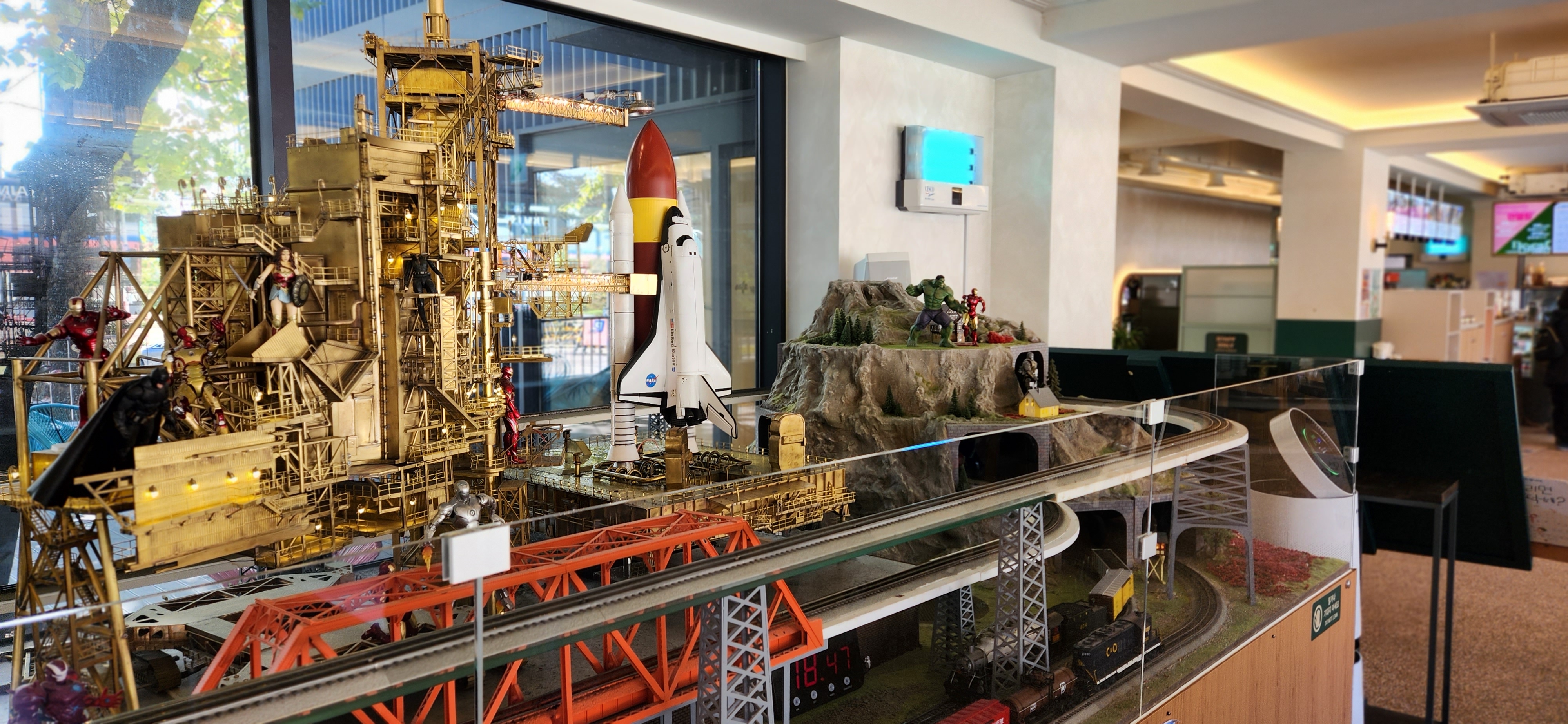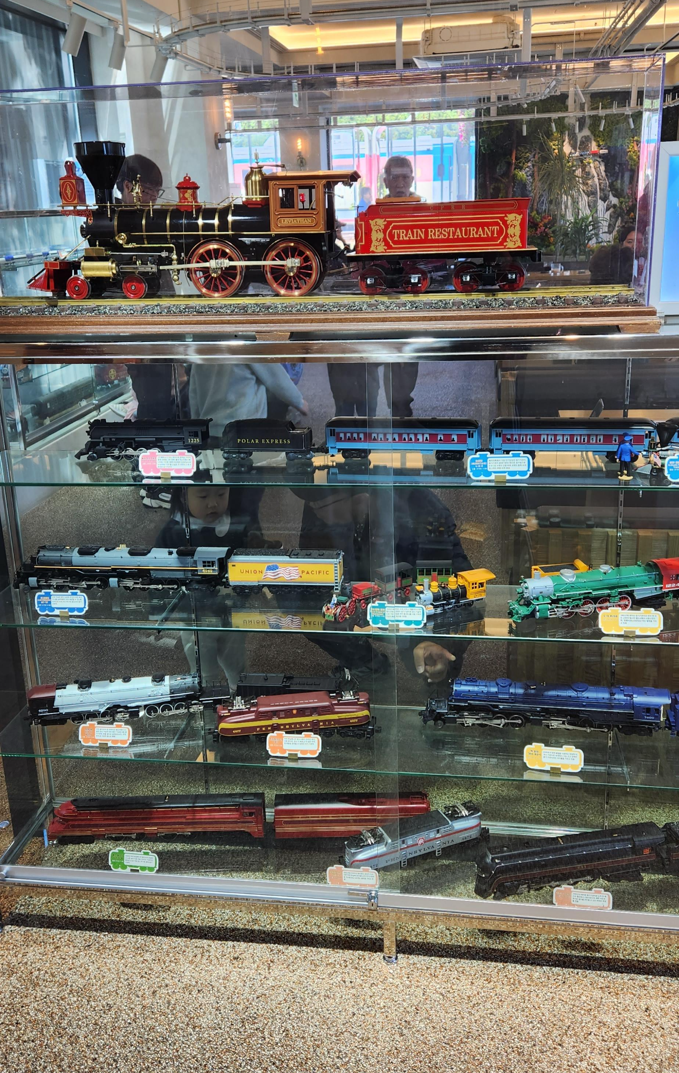 그리고 가운데에는 이렇게 우주선 모형과 그 주위를 빙글빙글 도는 기차들이 있어요. 우주선은 20분 간격으로 하늘로 날아오릅니다. 아기가 너무너무 좋아하더라구요.