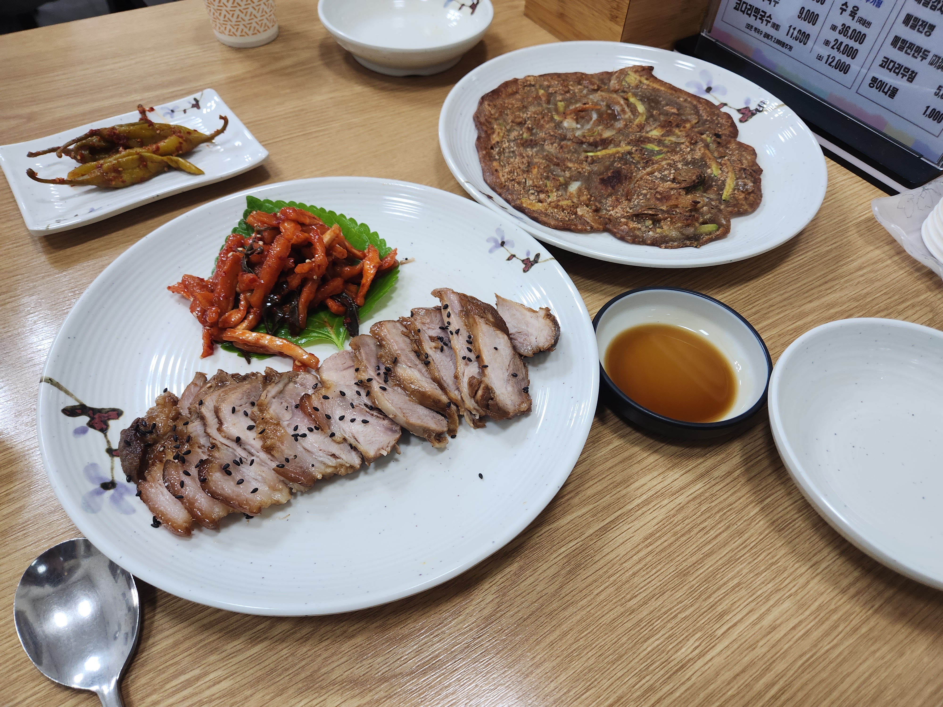 정식시키면 나오는 수육과 메밀감자전이에요 ㅎㅎ 2인분 기준 양이에요.